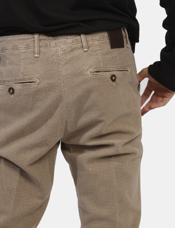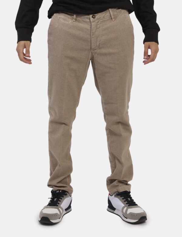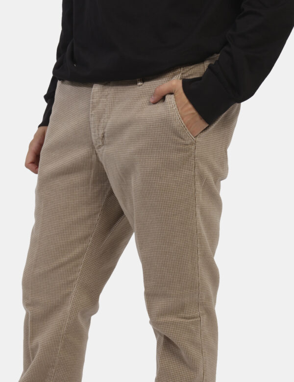 Pantaloni in simil velluto in fantasia quadrettata beige. Presenti tasche a taglio trasversale sul fronte e tasche a taglio sul retro. La vestibilità è morbida e pratica grazie a bottone ad asola più zip. I pantaloni sono adatti per occasioni casual e facilmente combinabili. Indossali una volta e scopri di non poterne più fare a meno.