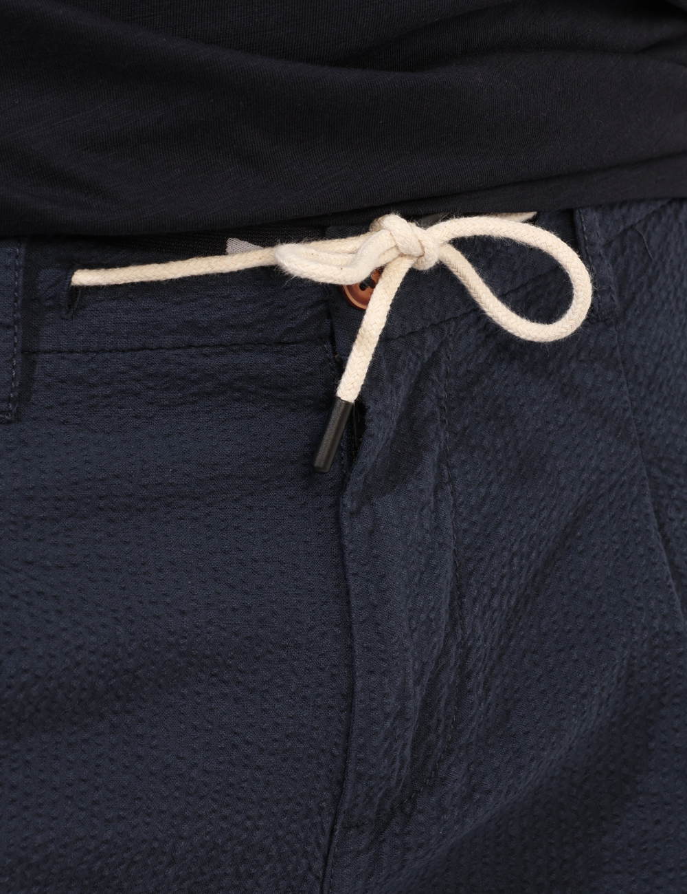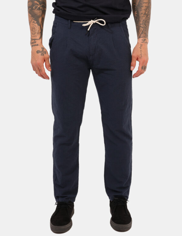 Pantaloni casual, leggeri, in total blu, tasche a taglio trasversale sul fronte e unica tasca a toppa sul retro. La vestibilità è morbida e regolabile grazie a coulisse in girovita con cordino abbinato più bottone e zip. I pantaloni sono adatti per occasioni casual e facilmente combinabili. Praticità e stile in un solo capo.