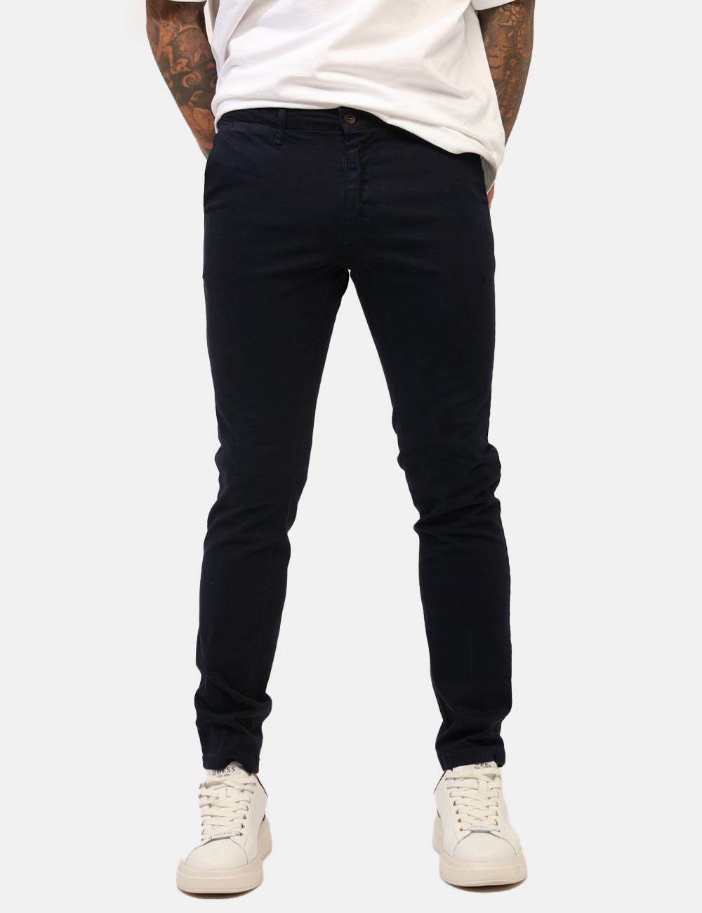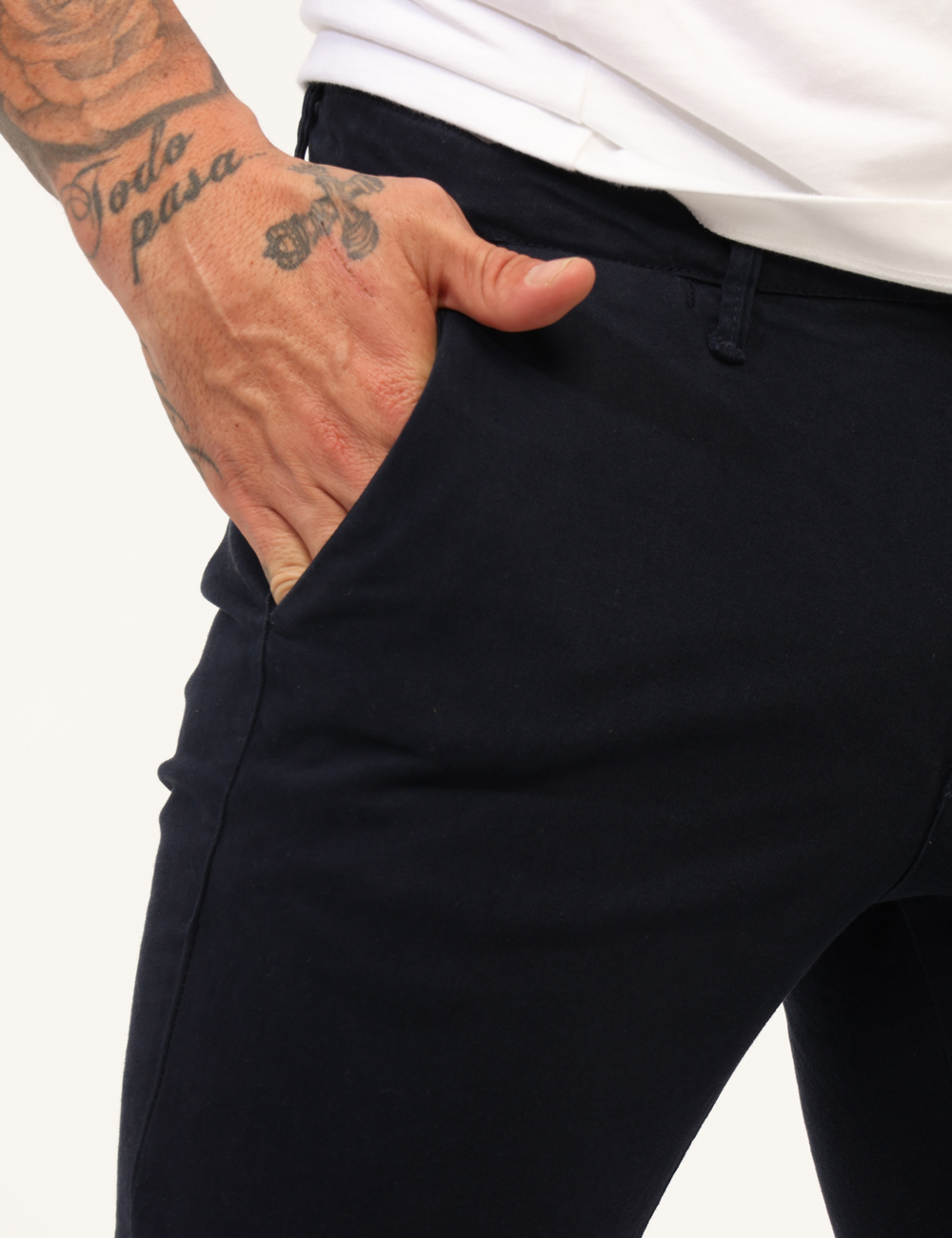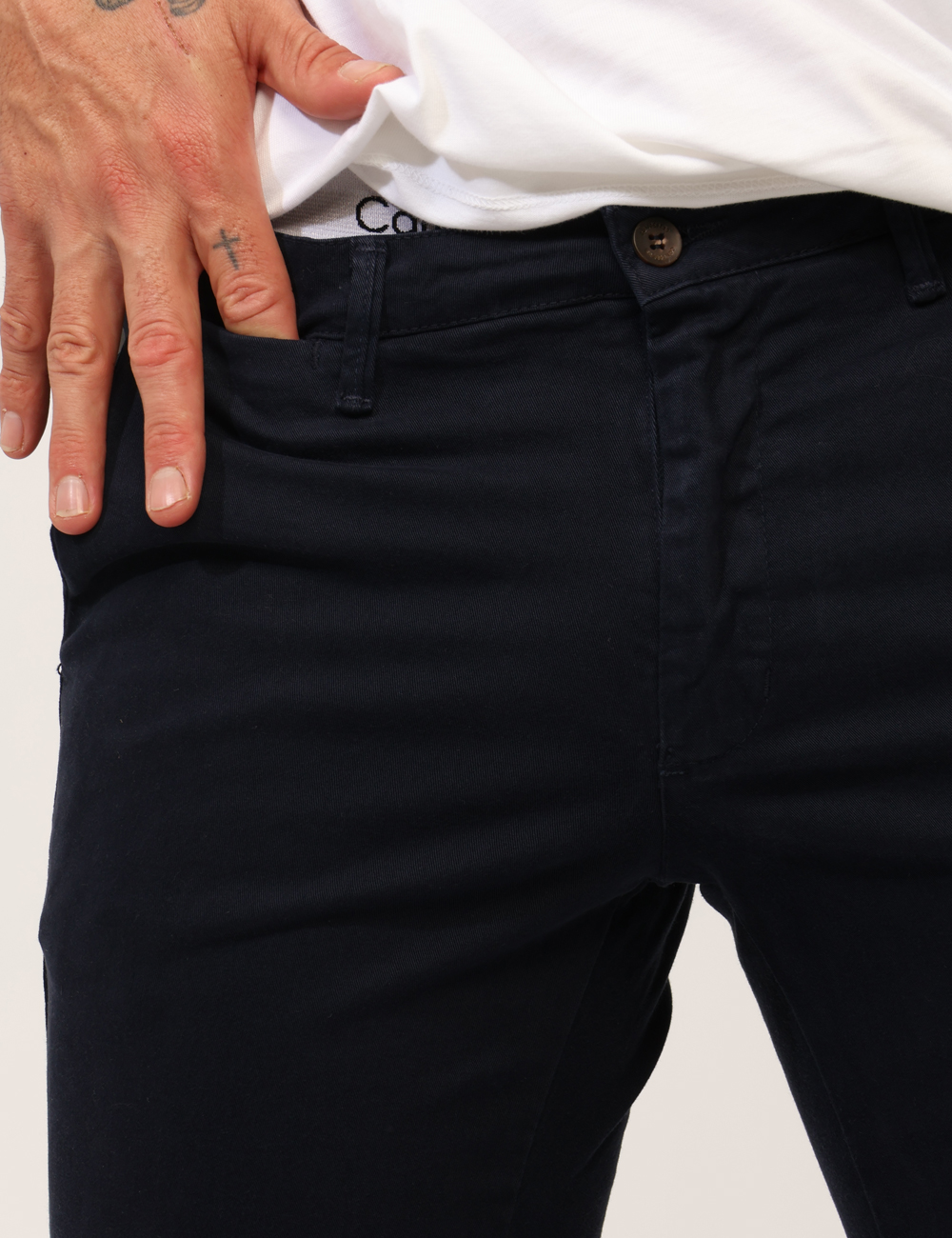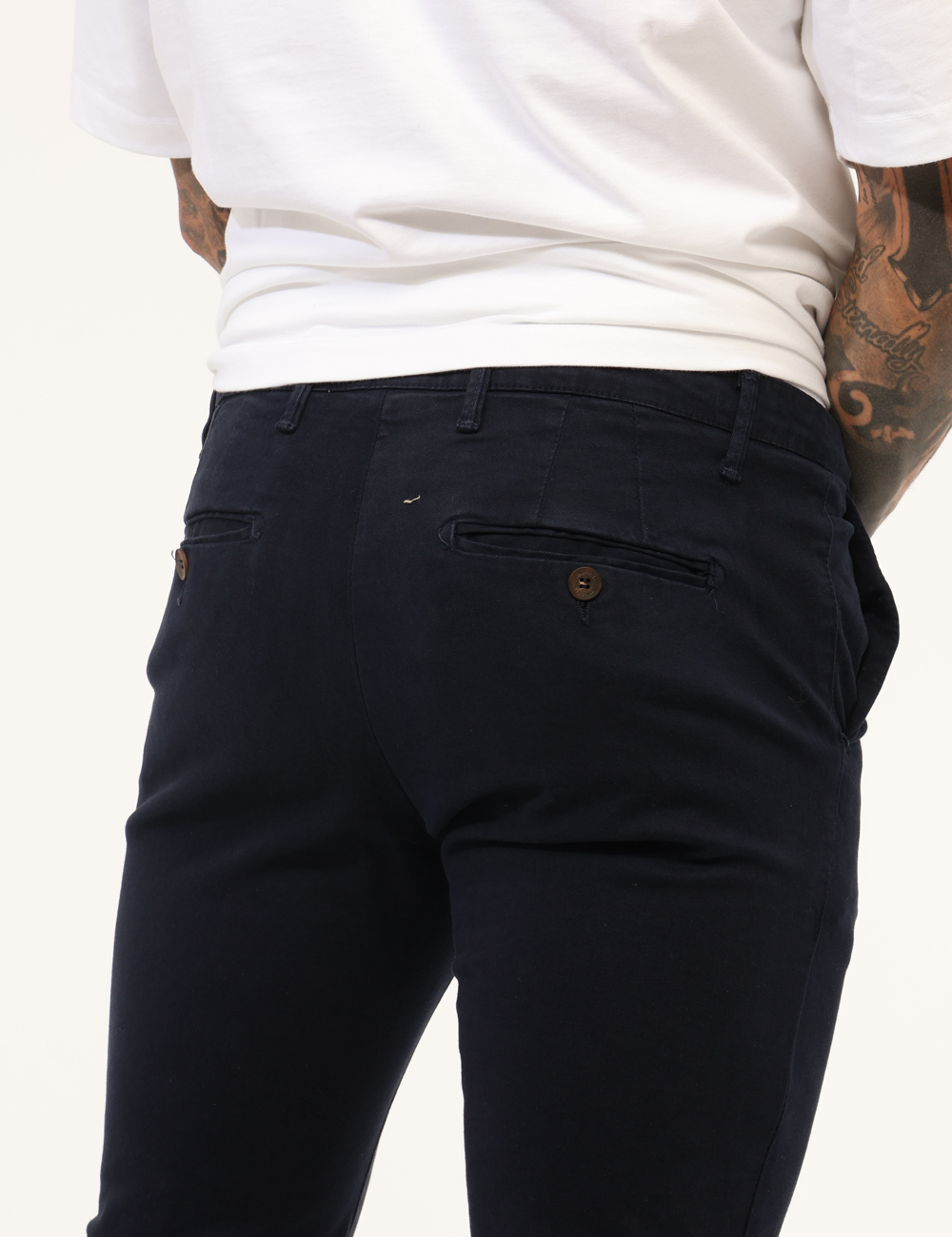 Pantaloni in total blu navy, con tasche a taglio trasversale sul fronte e tasche a fessura con bottone sul retro. La vestibilità è morbida e pratica grazie a bottone più zip. I pantaloni sono adatti per occasioni casual e facilmente combinabili. Aggiungili al tuo guardaroba e saprai sempre cosa indossare.