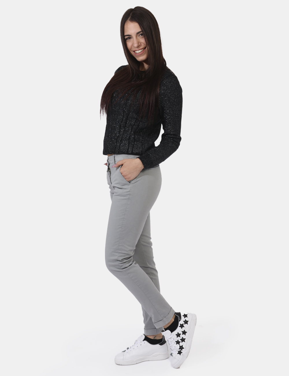 Pantaloni in cotone ed in total grigio perla con tasche a taglio trasversale e fake tasche sul retro. Presente risvoltino e piega centrale. La vestibilità è morbida e pratica grazie a bottone ad asola più zip. I pantaloni sono adatti per occasioni casual e facilmente combinabili. Indossali una volta e scopri di non poterne più fare a meno.