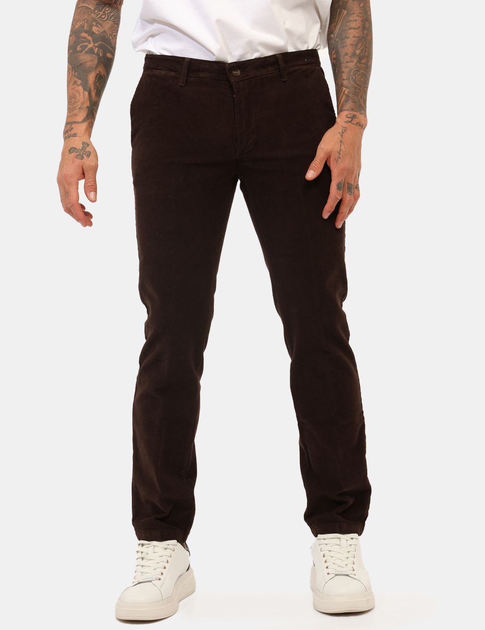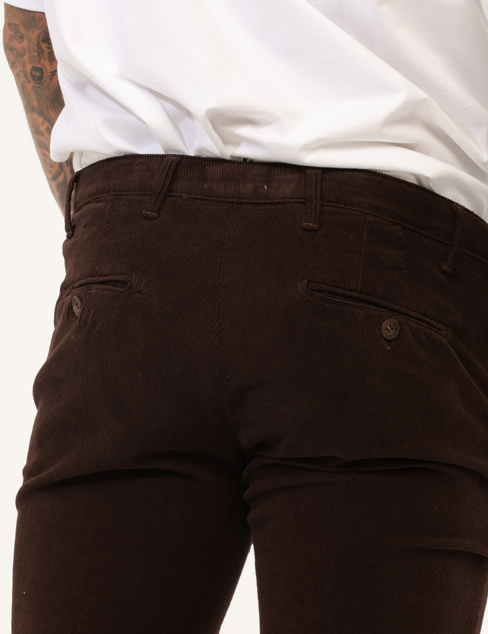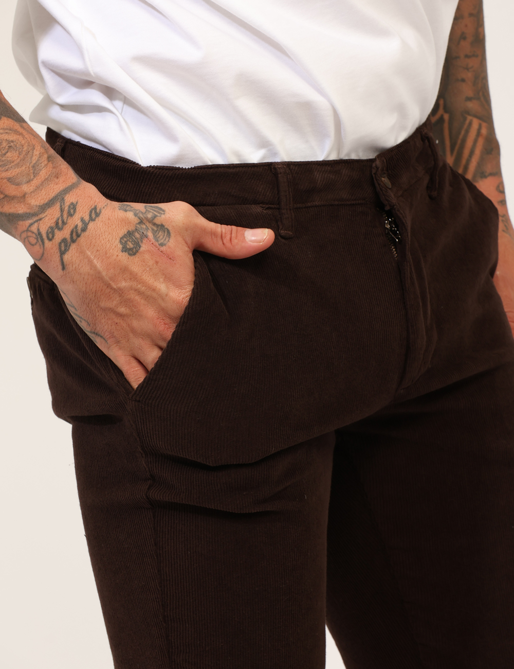 Pantaloni in simil velluto, total Marrone testa di moro, con tasche a taglio trasversale e tasche a fessura con bottone ad asola. La vestibilità è morbida e pratica grazie a bottone più zip. I pantaloni sono adatti per occasioni casual e facilmente combinabili. Indossali una volta e scopri di non poterne più fare a meno.