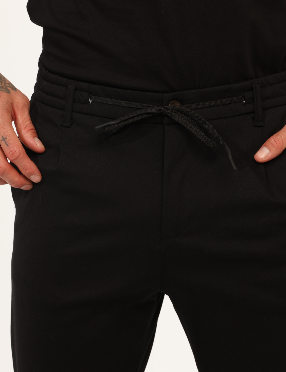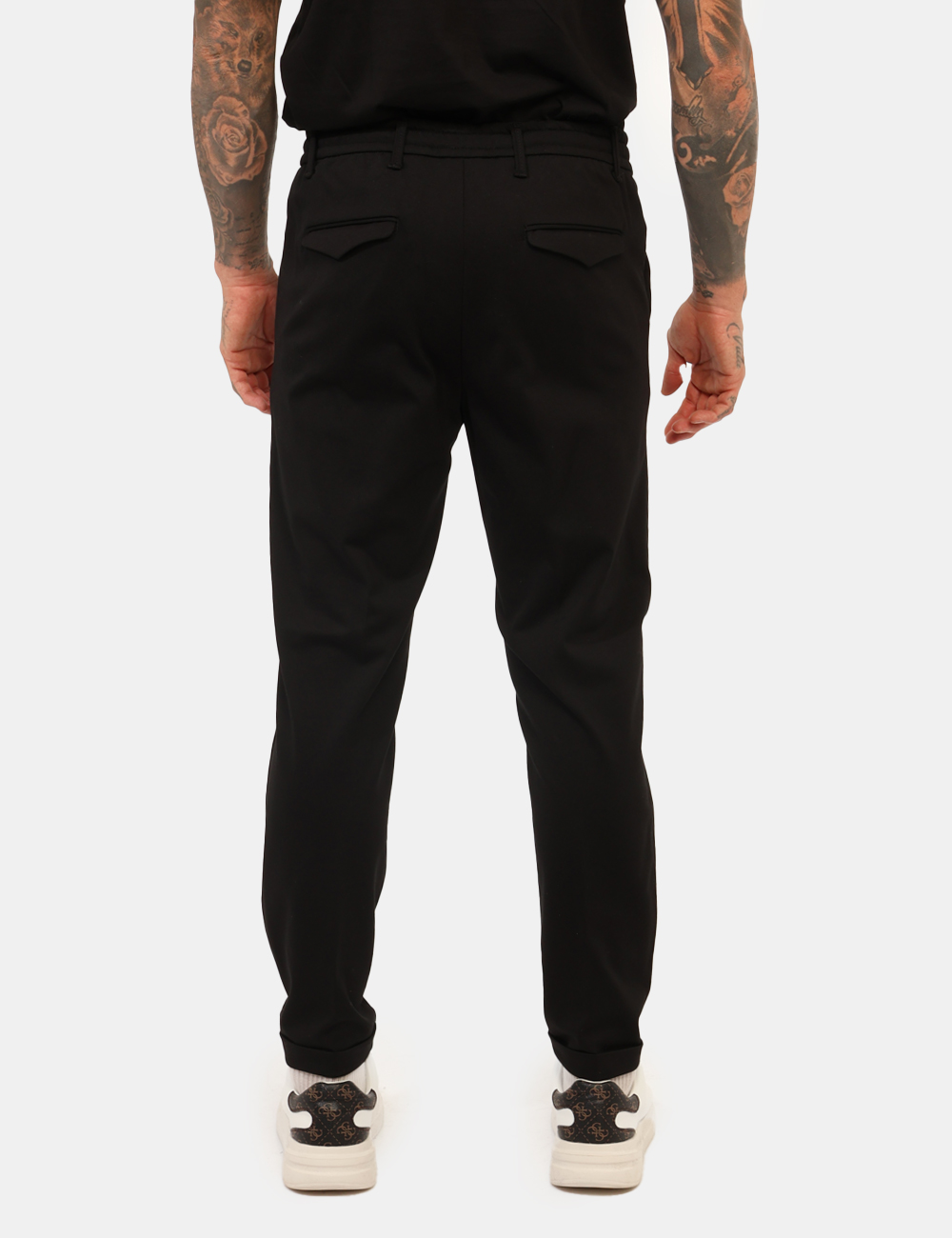 Pantaloni casual, in total nero con risvoltino, tasche a taglio trasversale e fake tasche sul retro. La vestibilità è morbida e pratica grazie a bottone più zip, ma anche regolabile grazie a coulisse in girovita con cordino abbinato. I pantaloni sono adatti per occasioni casual e facilmente combinabili. Indossali per spiccare con stile.