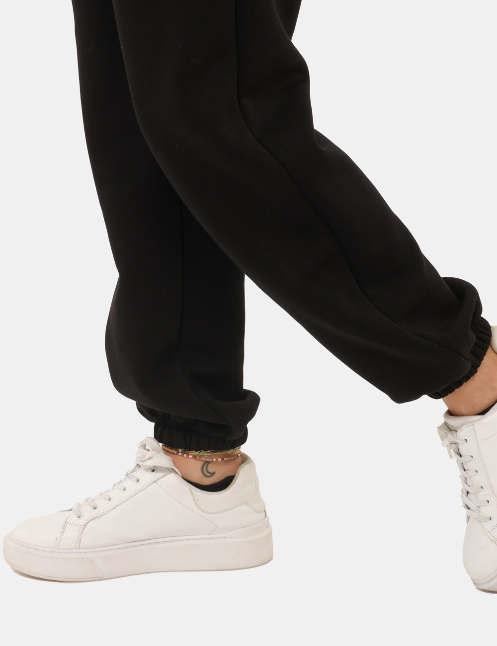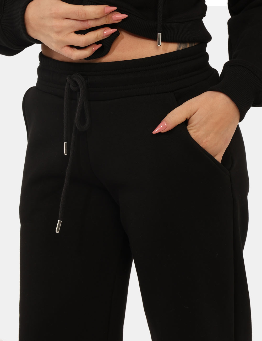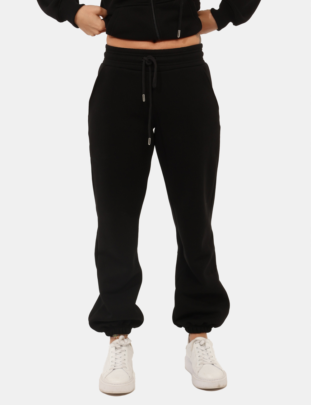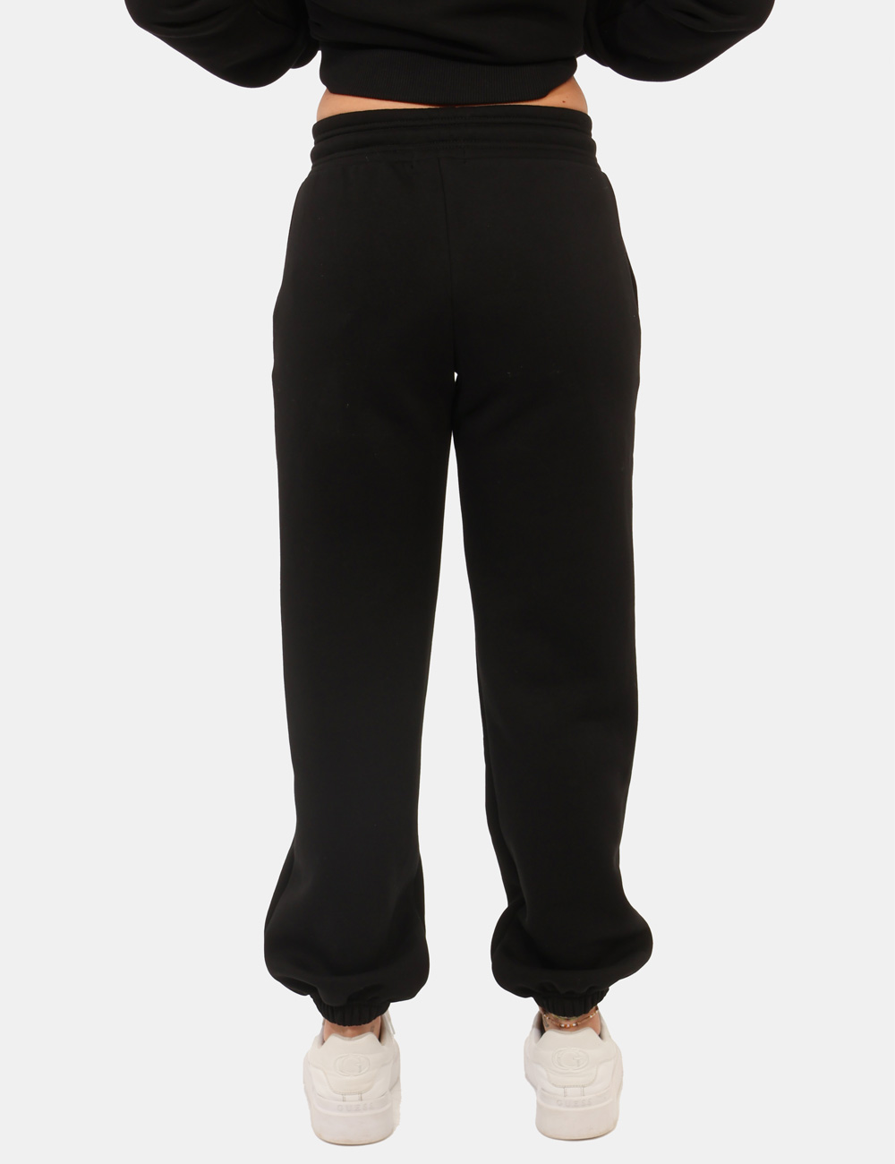 Pantaloni felpati in total nero, con polsino e tasche a taglio trasversale. La vestibilità è morbida e regolabile grazie a coulisse in girovita con cordino abbinato. I pantaloni sono adatti per occasioni casual e facilmente combinabili. Indossali per essere sempre a tuo agio.