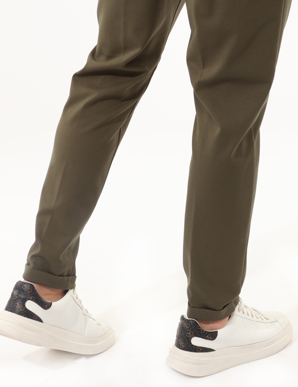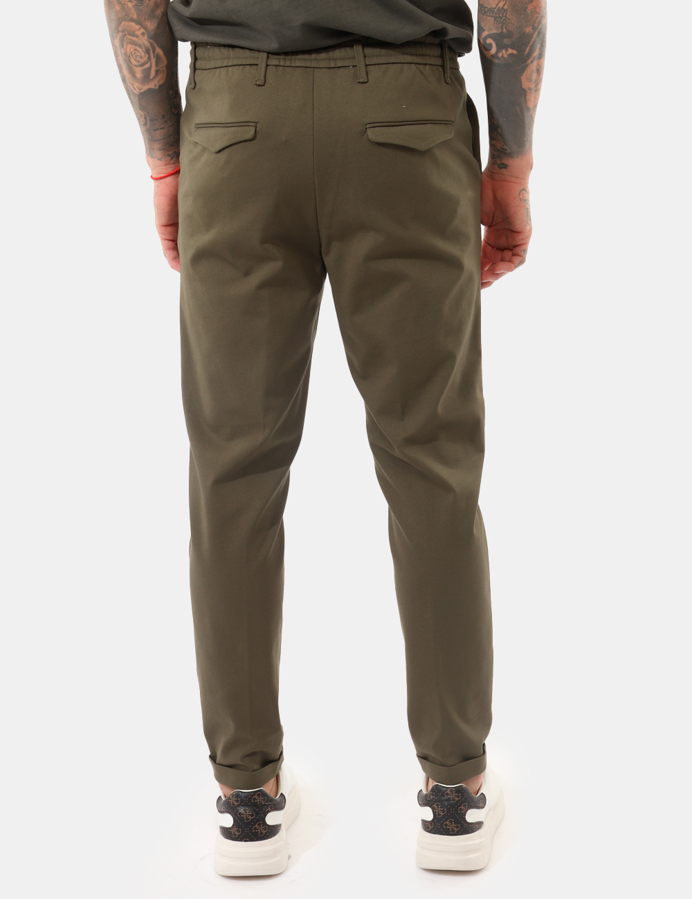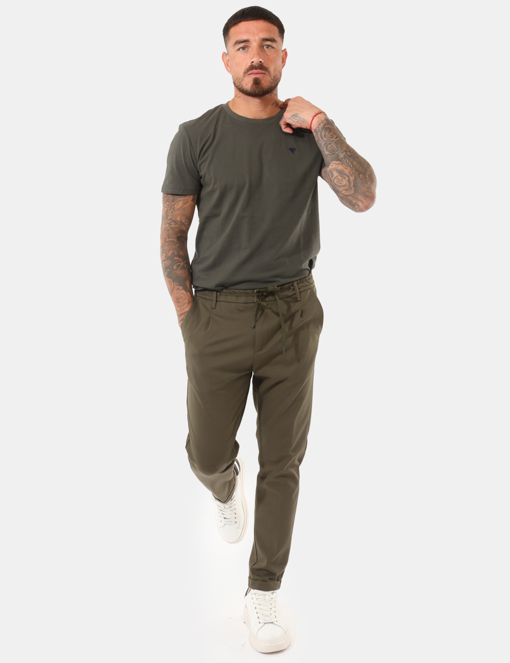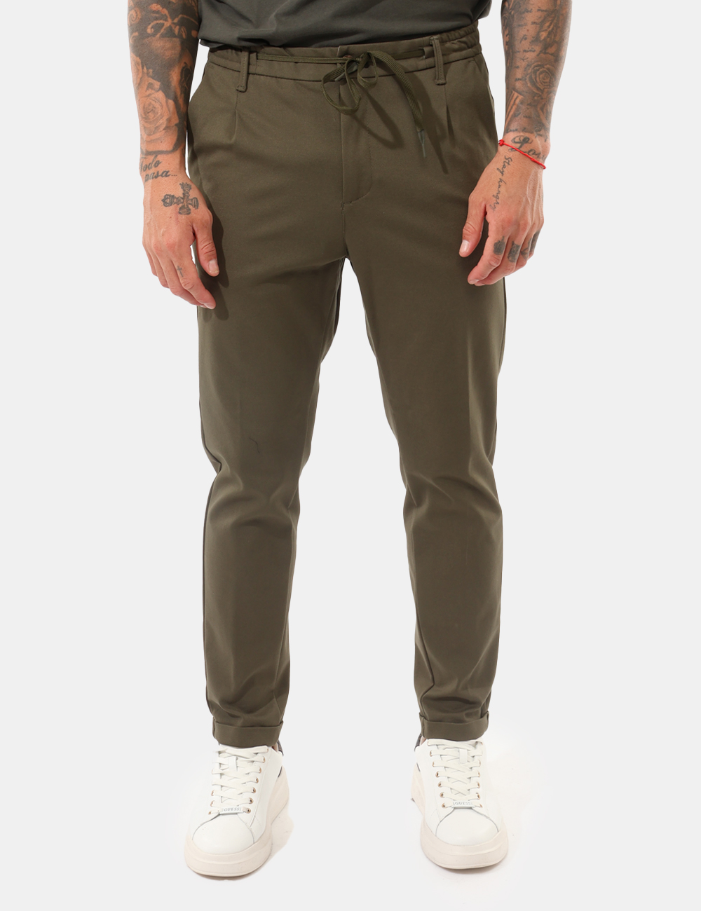 Pantaloni casual, in total verde con risvoltino, tasche a taglio trasversale e fake tasche sul retro. La vestibilità è morbida e pratica grazie a bottone più zip, ma anche regolabile grazie a coulisse in girovita con cordino abbinato. I pantaloni sono adatti per occasioni casual e facilmente combinabili. Indossali per spiccare con stile.