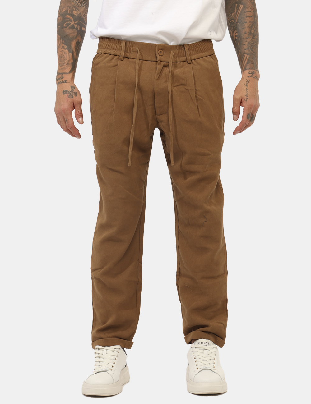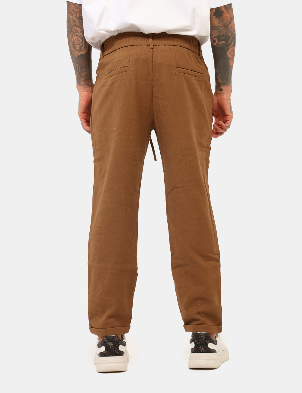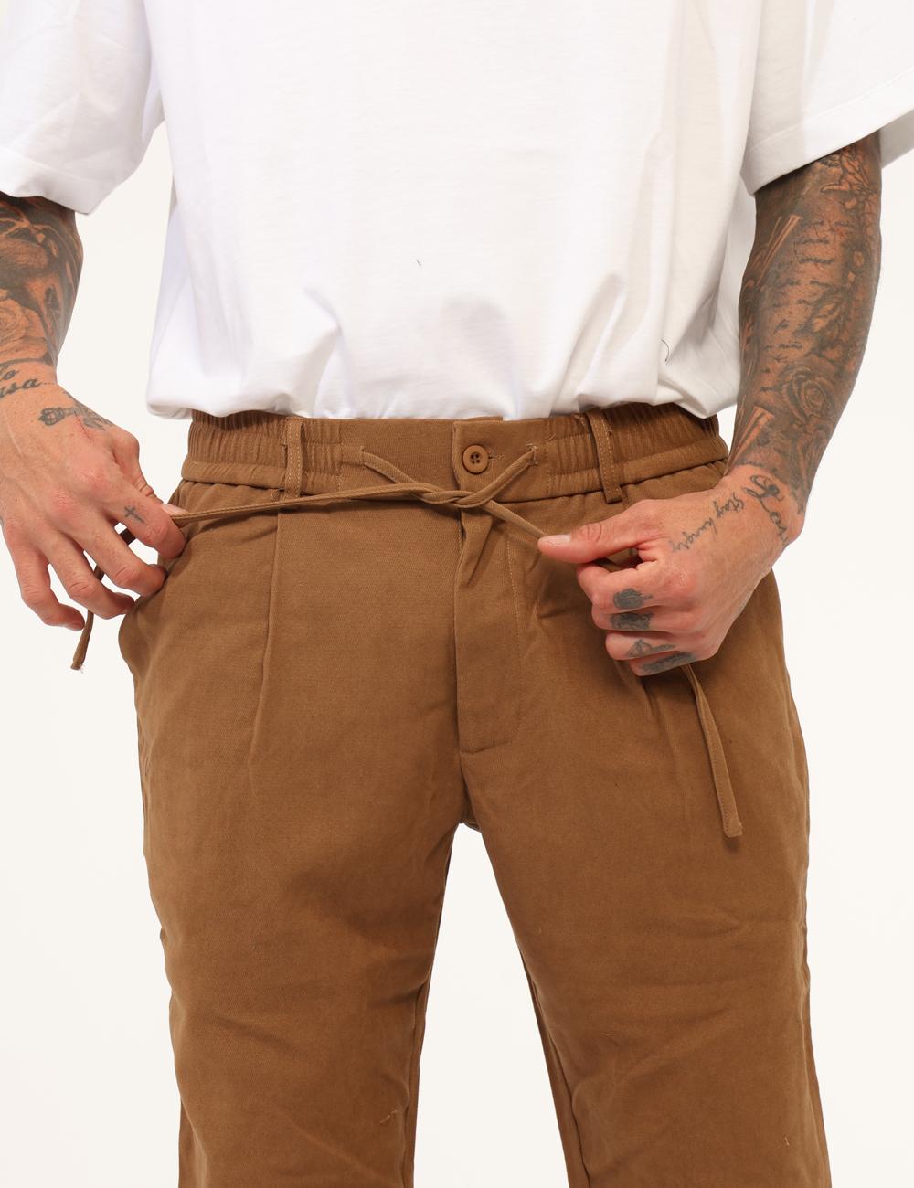 Pantaloni raffinati, in total marrone cammello con tasche a taglio trasversale e tasche fake sul retro. La vestibilità è morbida e regolabile grazie a coulisse in girovita con cordino abbinato più bottone e zip. I pantaloni sono adatti per occasioni casual e facilmente combinabili. Troppo comodi per poterne fare a meno.