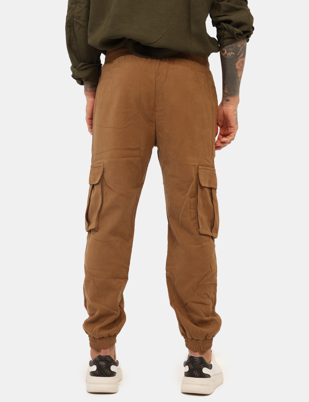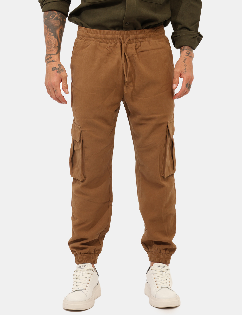 Pantaloni modello cargo, in total marrone cammello con tasche a taglio trasversale e tasche a toppa laterali. La vestibilità è morbida e regolabile grazie a coulisse in girovita con cordino abbinato. I pantaloni sono adatti per occasioni casual e facilmente combinabili. Troppo comodi per poterne fare a meno.
