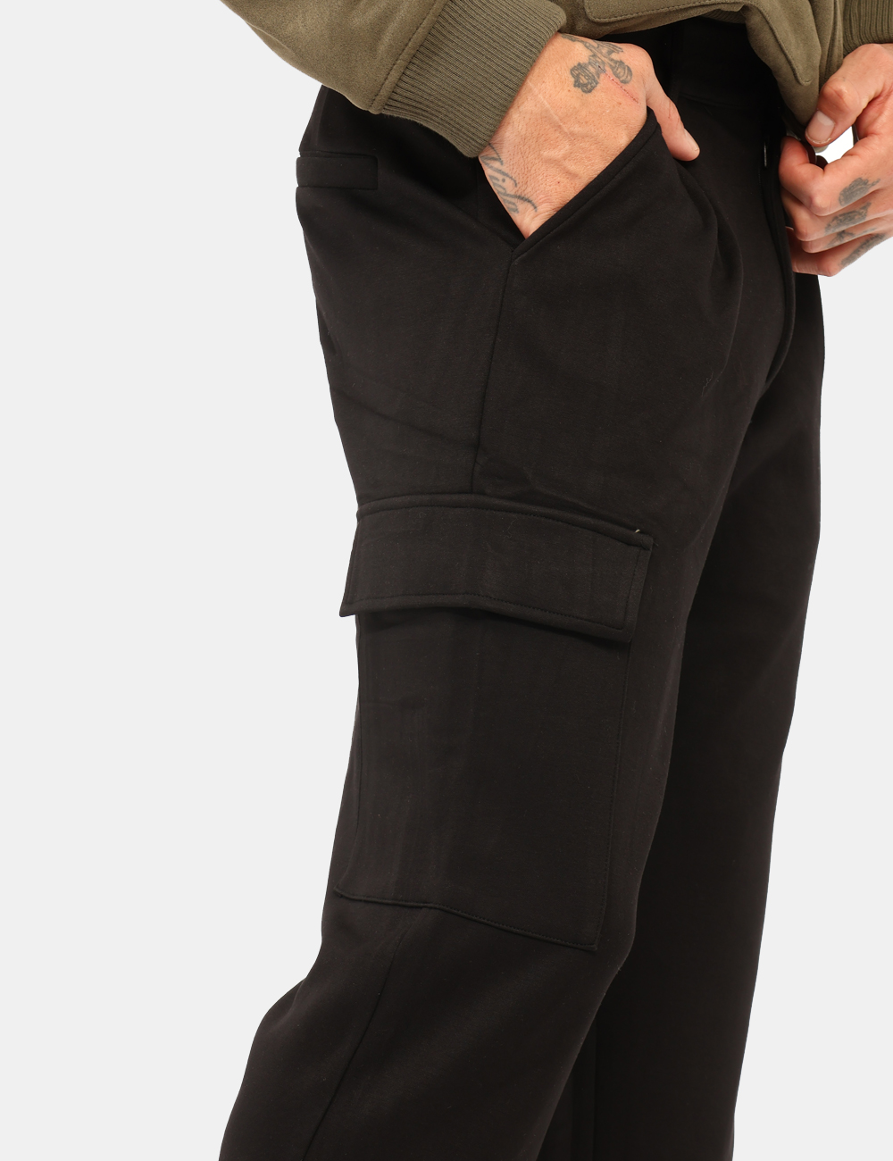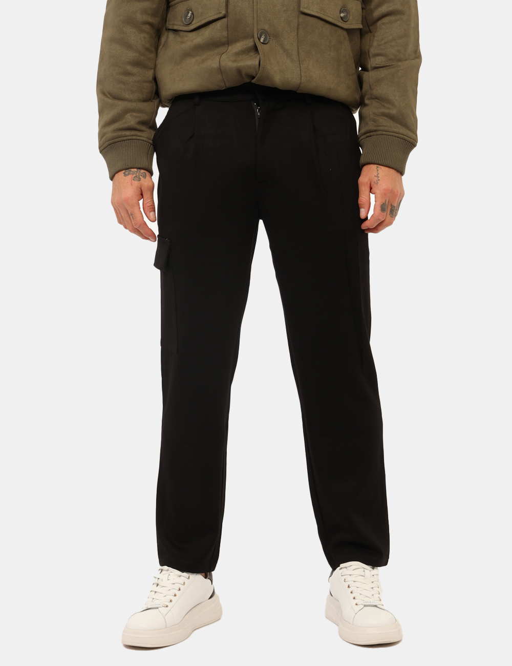 Pantaloni modello cargo, in total nero con tasche a taglio trasversale e tasche a toppa laterali. La vestibilità è morbida e pratica grazie a bottone. I pantaloni sono adatti per occasioni casual e facilmente combinabili. Troppo comodi per poterne fare a meno.