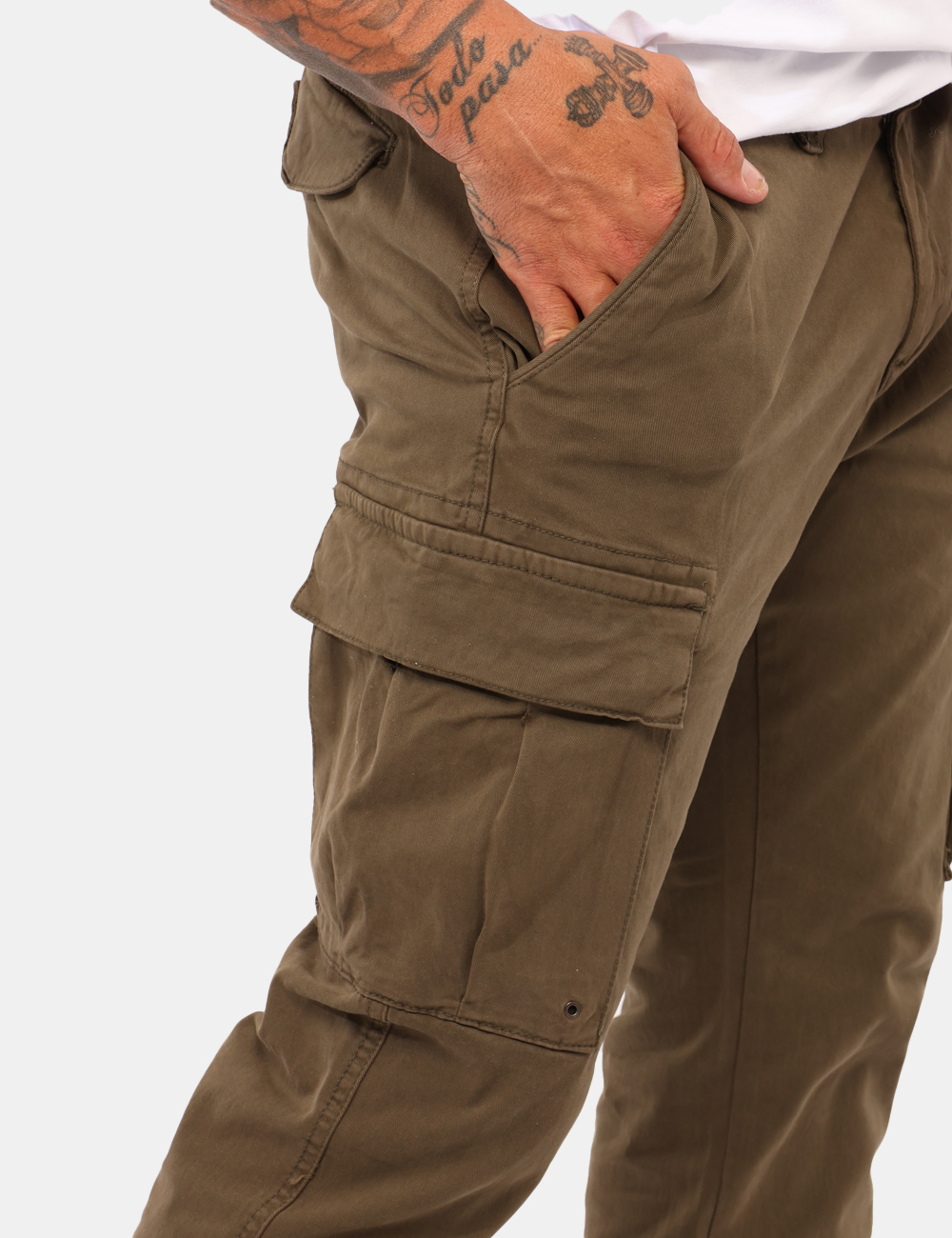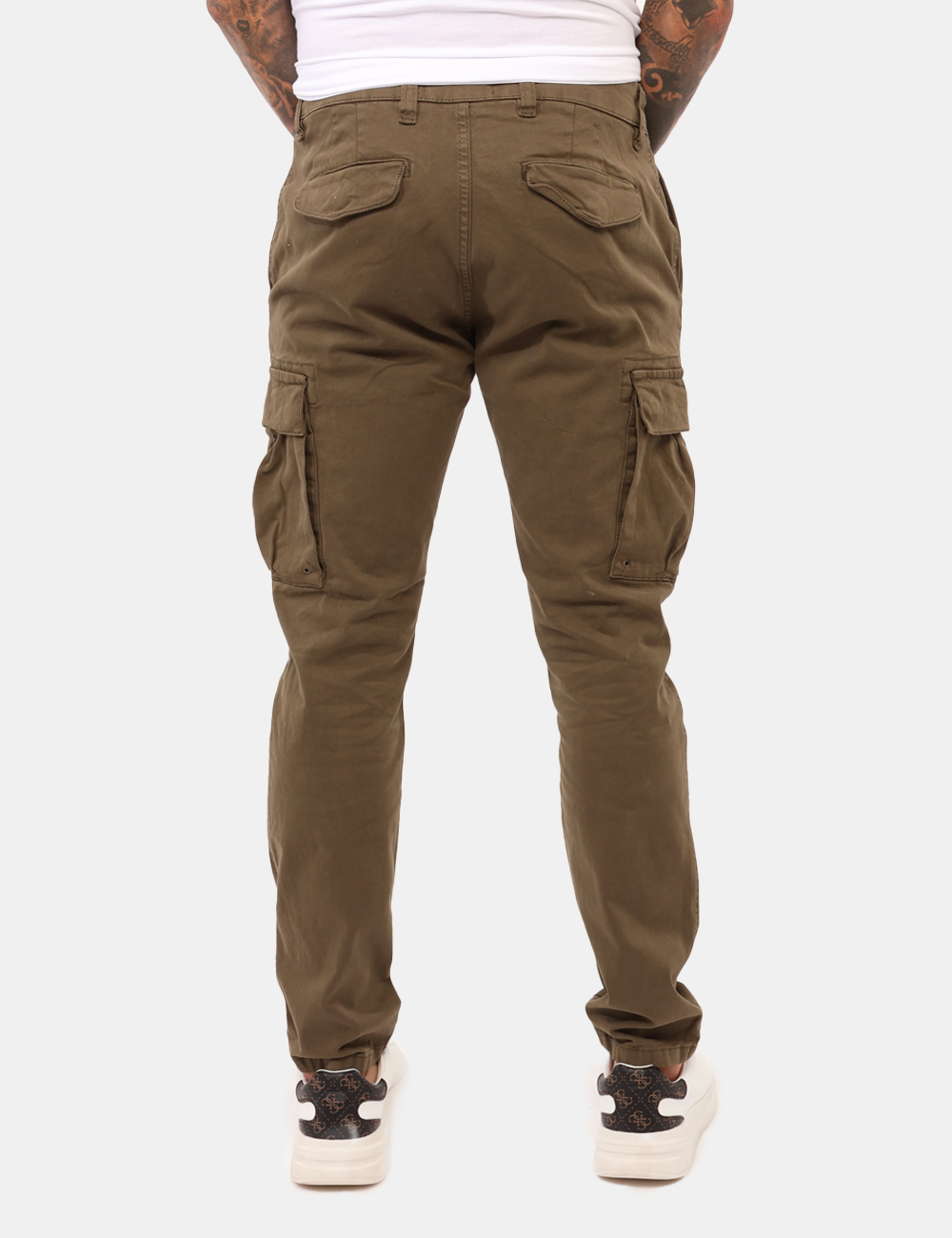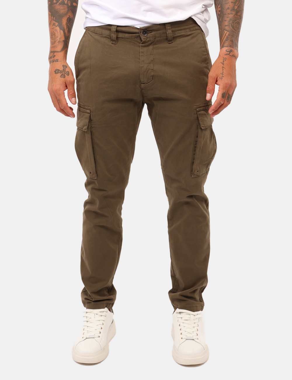 Pantaloni cargo in total verde militare, con tasche a taglio trasversale, tasche laterali e tasche a toppa sul retro. La vestibilità è morbida e pratica grazie a bottone più zip. I pantaloni sono adatti per occasioni casual. Praticità e stile in un solo capo.