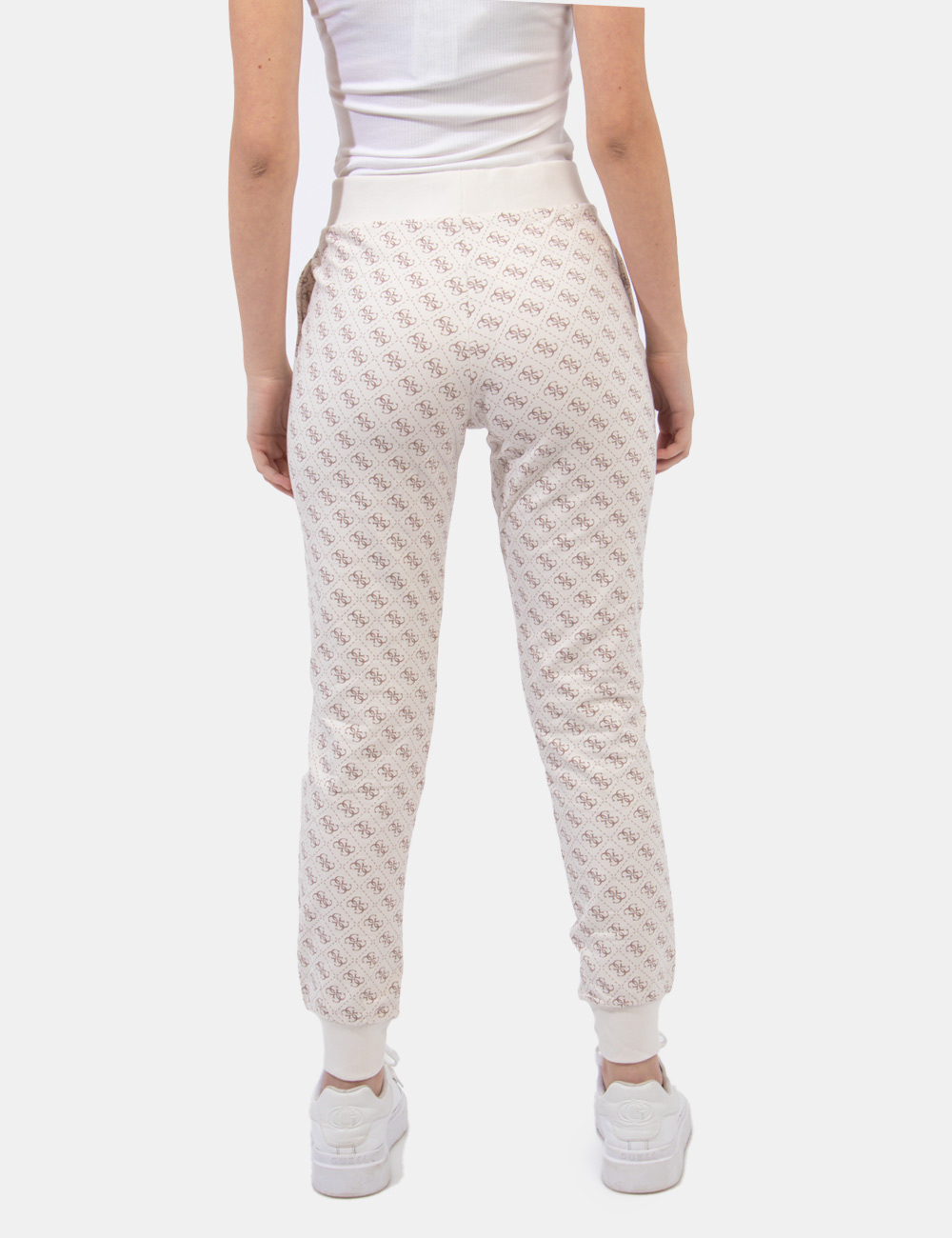 Pantaloni felpati su base beige con stampa allover logo brand in tinta marrone. Presenti tasche a taglio trasversale più polsini sul girocviglia. La vestibilità è morbida e regolabile grazie ad elastico in girovita. I pantaloni sono adatti per occasioni casual. Praticità e stile in un solo capo.