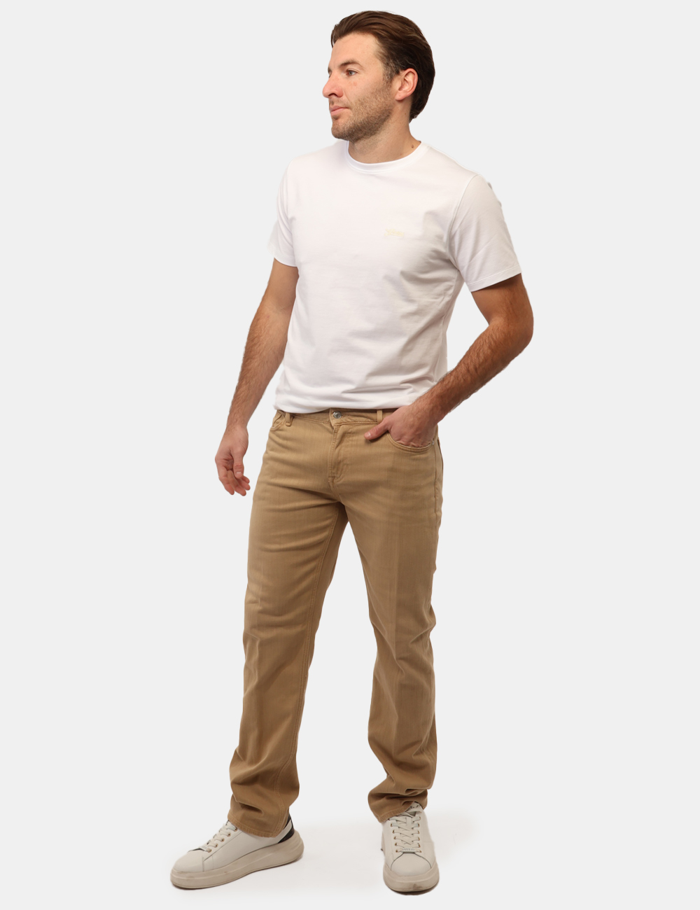 Il design presenta Pantaloni in tonalità sabbia con tasche, bottone e zip, dettagli funzionali che completano una linea pulita e moderna. La vestibilità slim valorizza la silhouette con un taglio asciutto e attuale. Il modello è alto 187 cm e indossa la taglia 34 US, corrispondente alla 48 italiana, un riferimento utile per aiutarti nella scelta della misura più adatta.
