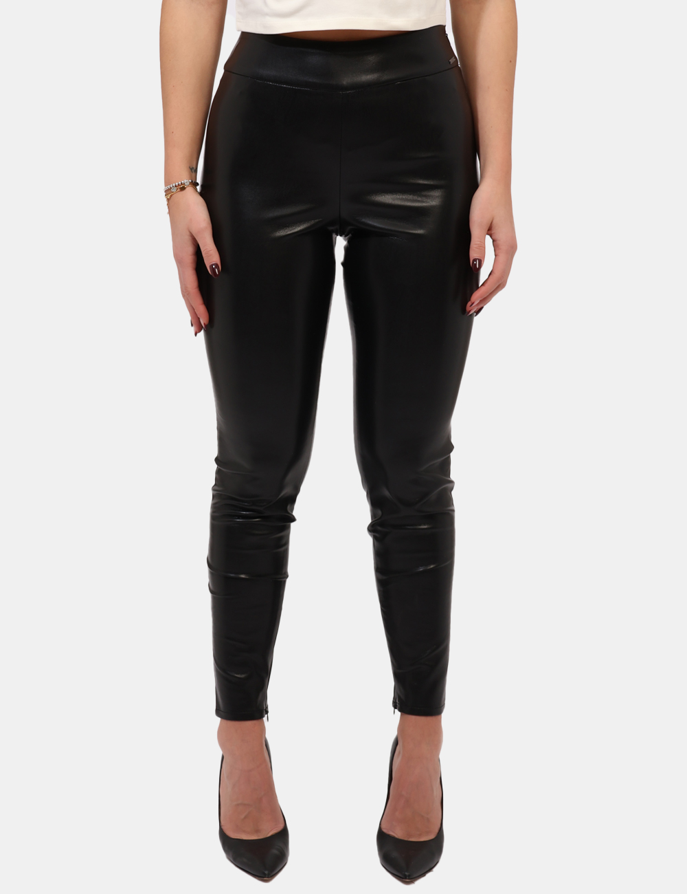 Pantaloni modello leggings in simil pelle nero. La vestibilità è morbida e regolabile grazie ad elastico in girovita. I leggings sono adatti per occasioni casuale e facilmente combinabili. Praticità e stile in un solo capo.