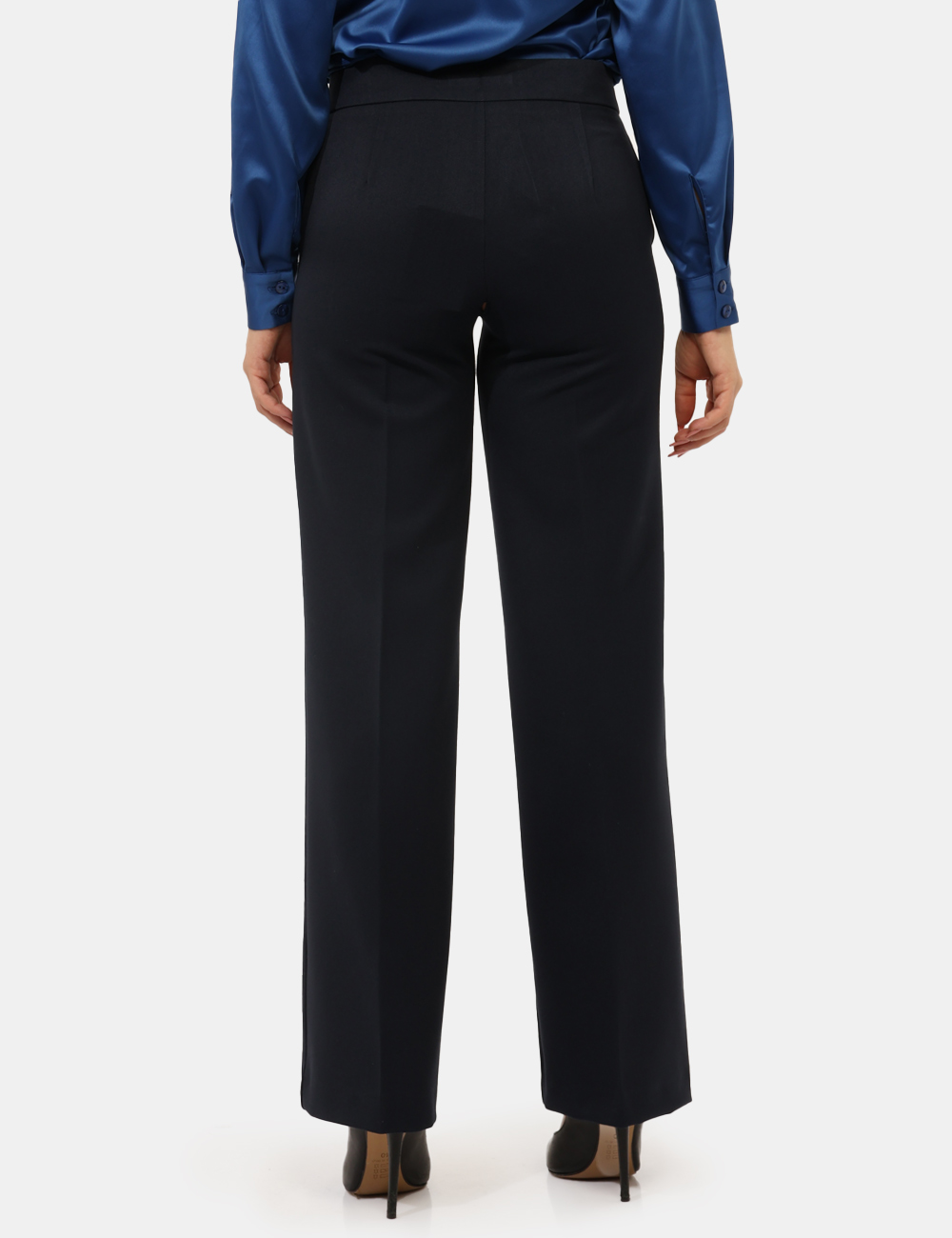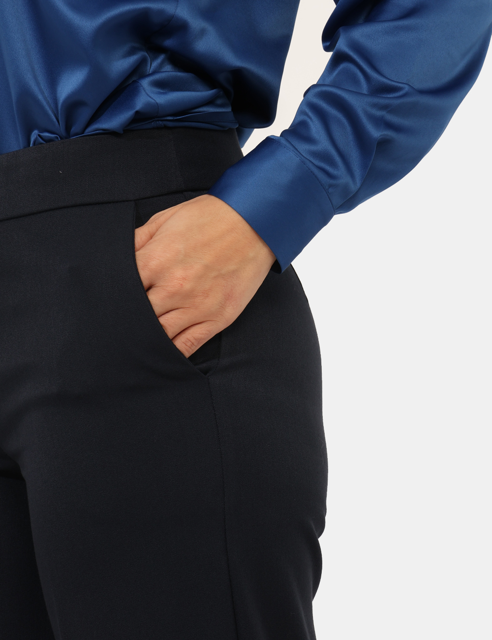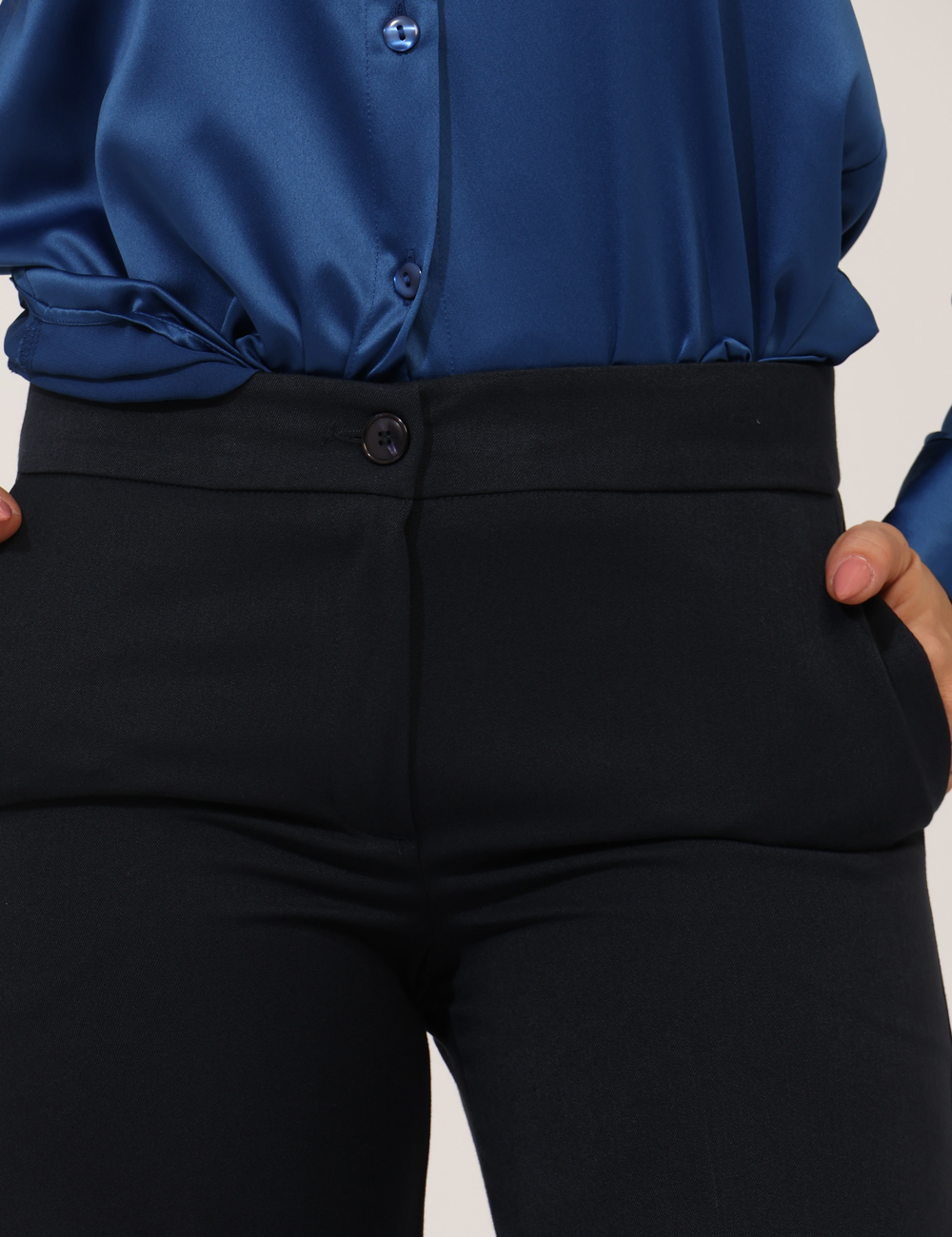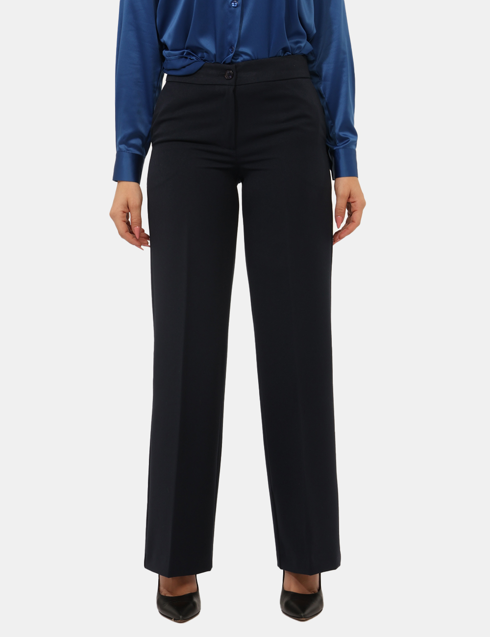 Pantaloni larghi, eleganti, total blu navy con tasche a taglio trasversale. La vestibilità è morbida e pratica grazie a bottone più zip. I pantaloni sono adatti per occasioni casual/raffinate e facilmente combinabili, ideali con il blazer in tinta per dar vita ad un tailleur perfetto. Indossali per essere impeccabile.