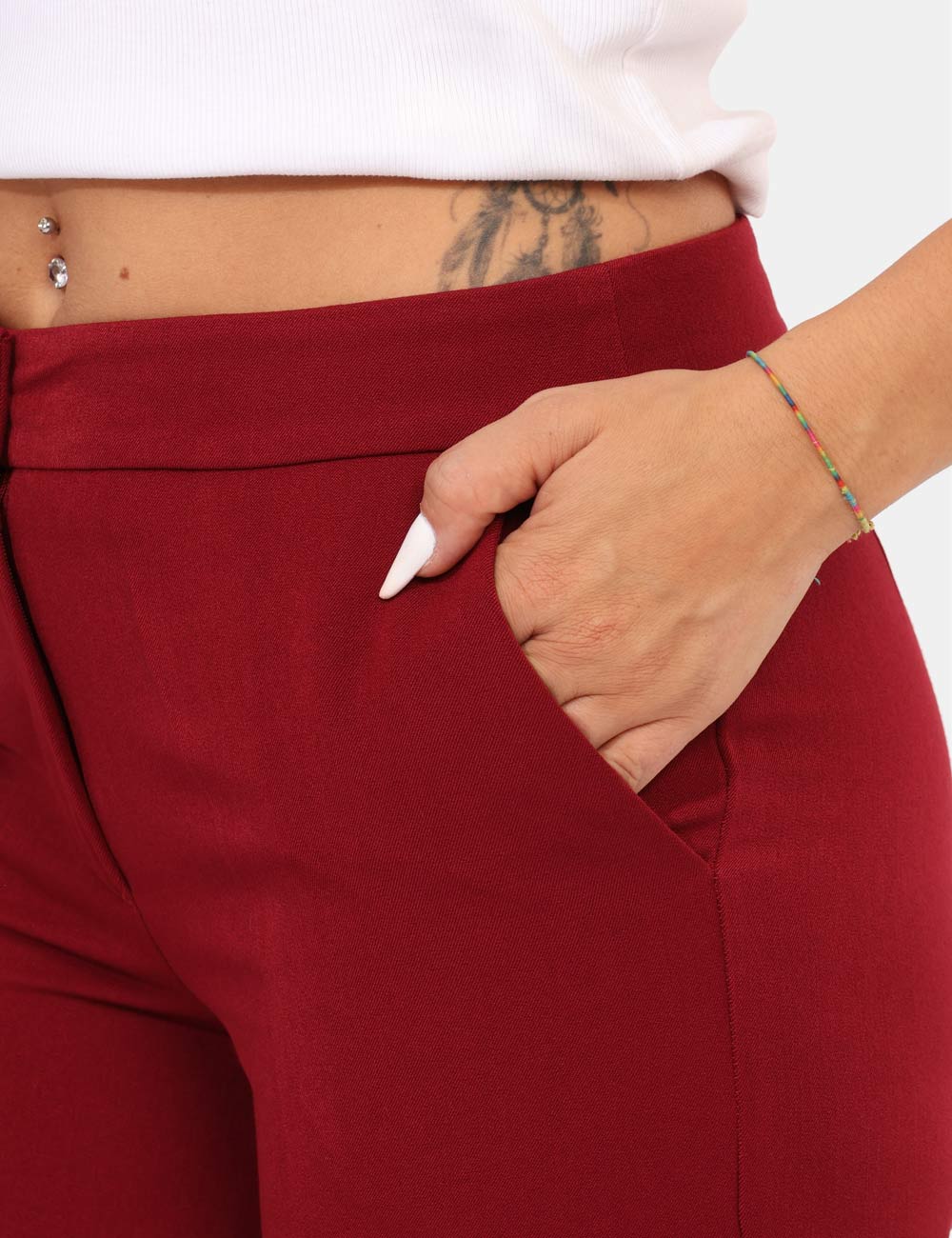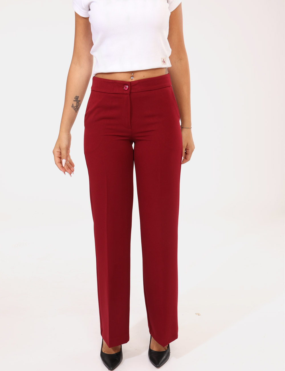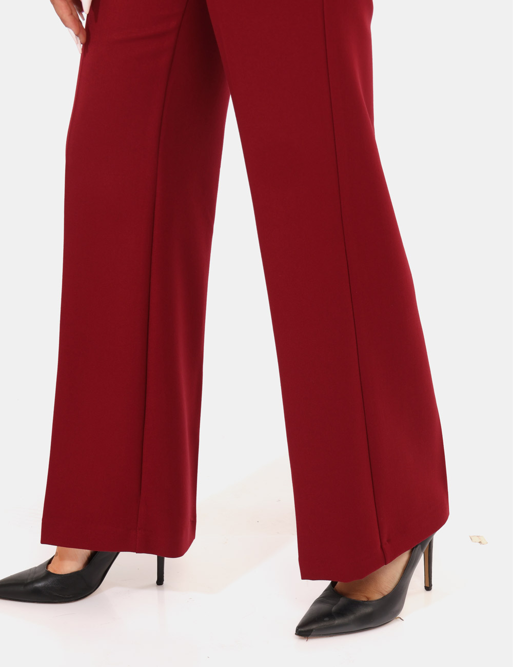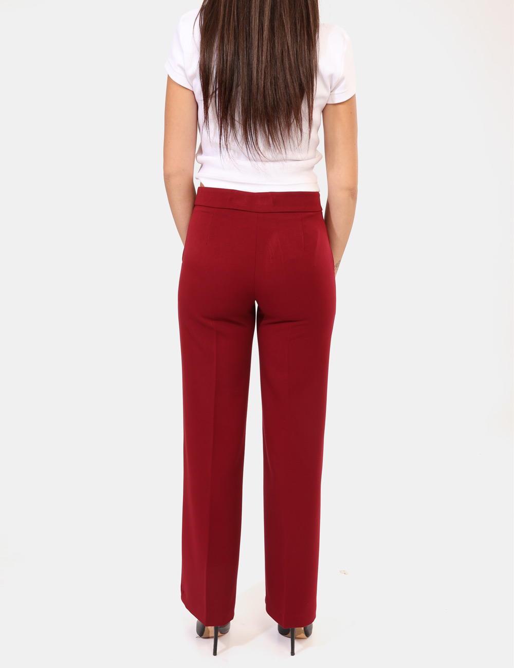 Pantaloni palazzo eleganti, in total bordeaux, con tasche a taglio trasversale e tasche fake sul retro. La vestibilità è morbida e pratica grazie a bottone più zip. I pantaloni sono adatti per occasioni casual/raffinate, perfetti in completo tailleur con il blazer abbinato. Indossali per essere impeccabile.