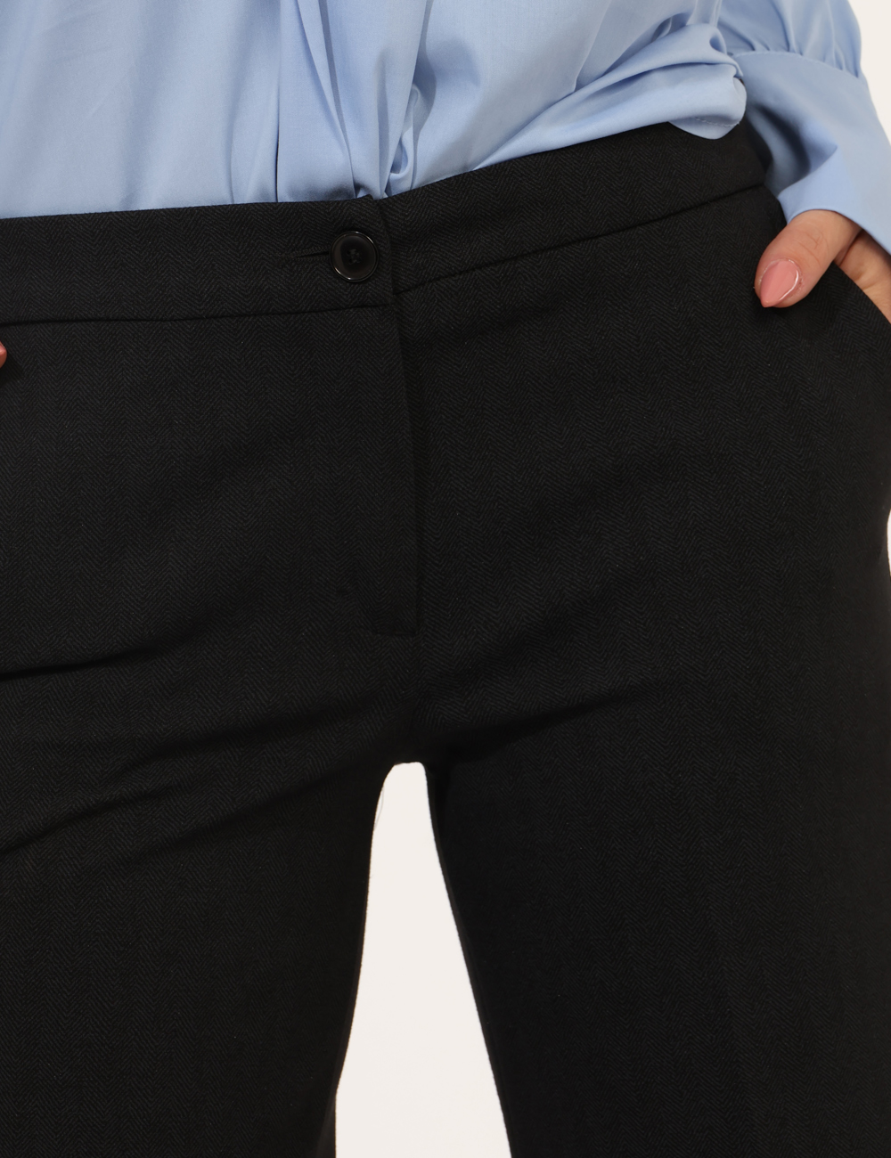 Pantaloni larghi, eleganti, in total nero, con tasche a taglio trasversale. La vestibilità è morbida e pratica grazie a bottone più zip. I pantaloni sono adatti per occasioni casual/raffinate e facilmente combinabili, ideali con il blazer in tinta per dar vita ad un tailleur perfetto. Indossali per essere impeccabile.