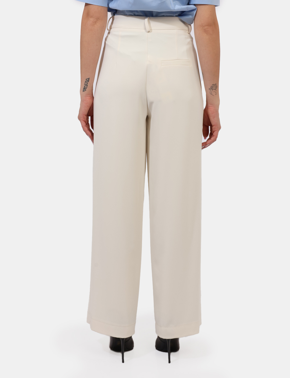 Pantaloni larghi, eleganti in total crema con fake tasche a taglio. La vestibilità è morbida e pratica grazie a bottone ad asola più zip. I pantaloni sono piacevolmente combinabili con il blazer coordinato per un tailleur perfetto. Indossali per spiccare con stile.