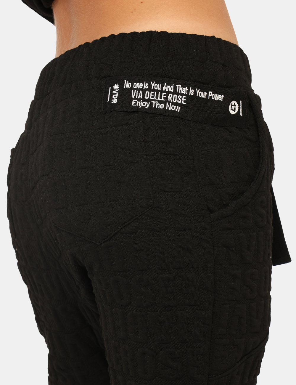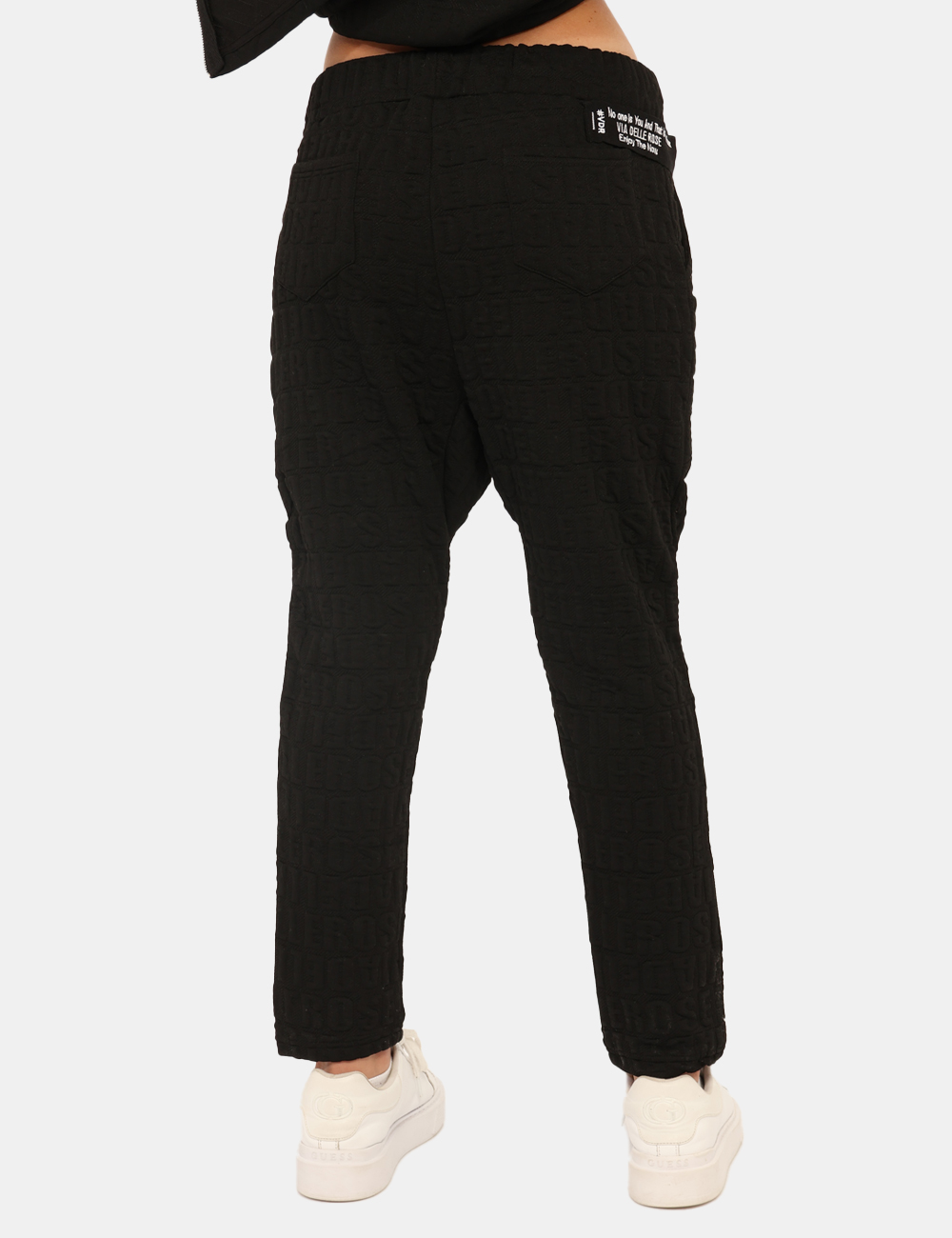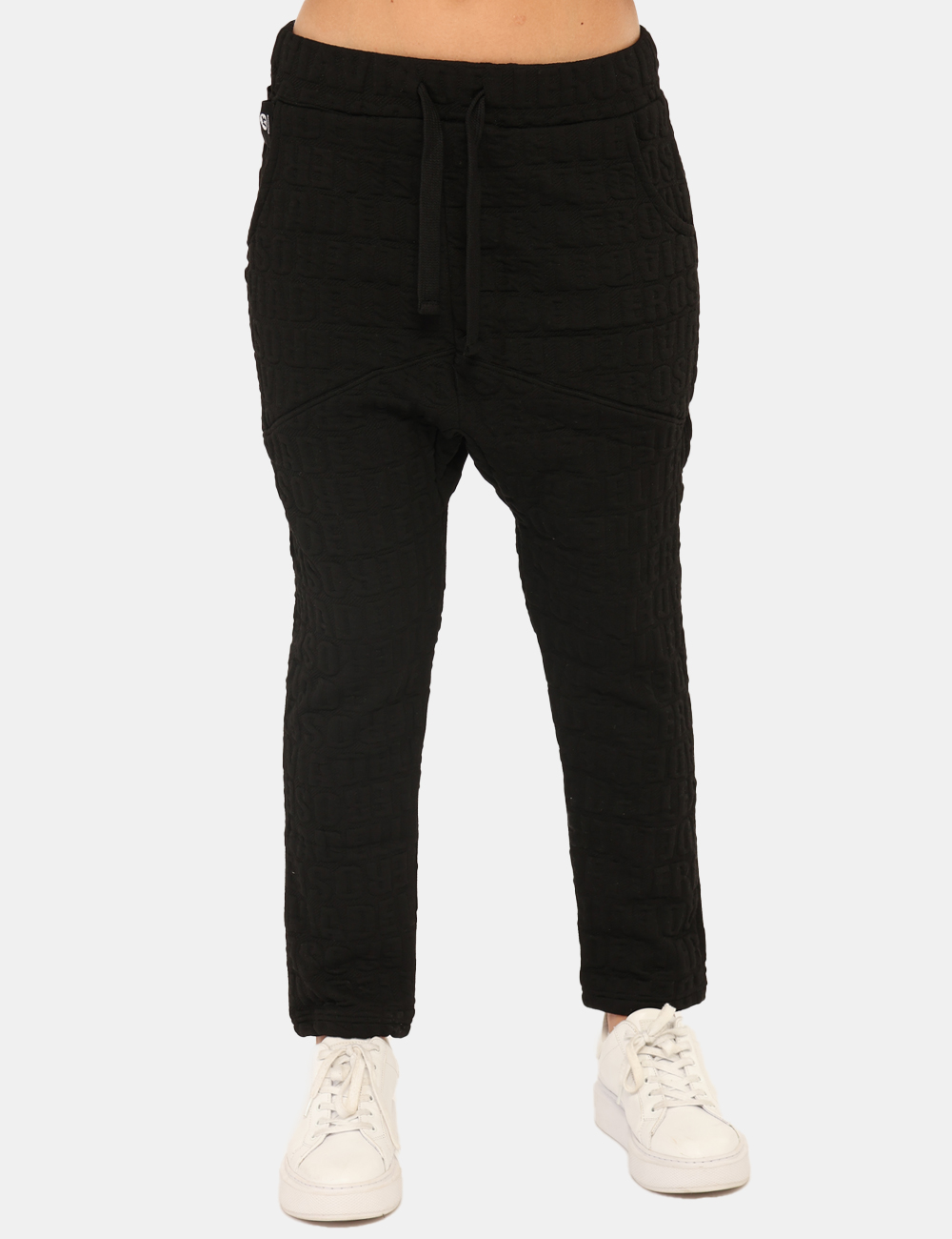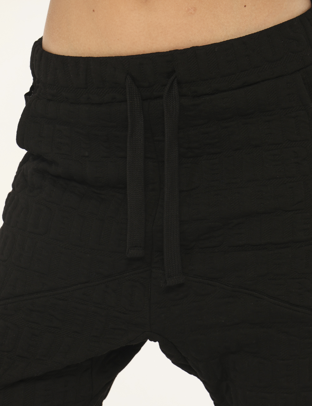 Pantaloni in tessuto total nero con logo brand in rilievo. Presenti tasche a taglio trasversale e tasche a toppa sul retro. La vestibilità è morbida e regolabile grazie a coulisse in girovita con cordino abbinato. I pantaloni sono adatti per occasioni casual e facilmente combinabili. Aggiungili al tuo guardaroba e saprai sempre cosa indossare.