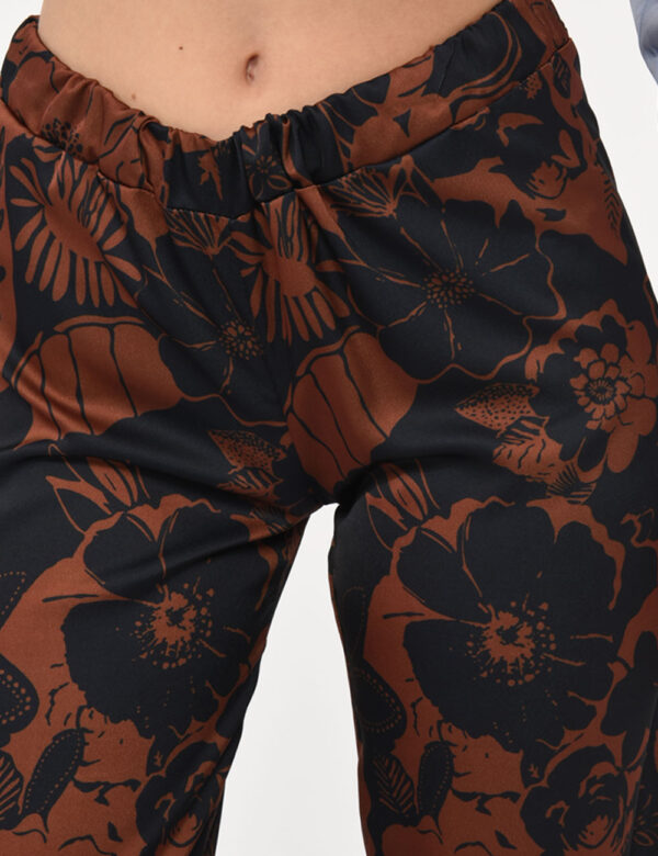 Pantaloni in simil raso ed in fantasia floreale marrone e blu navy. La vestibilità è morbida e regolabile grazie ad elastico in girovita. I pantaloni sono adatti per occasioni casual/raffinate e facilmente combinabili. Troppo fashion per poterne fare a me