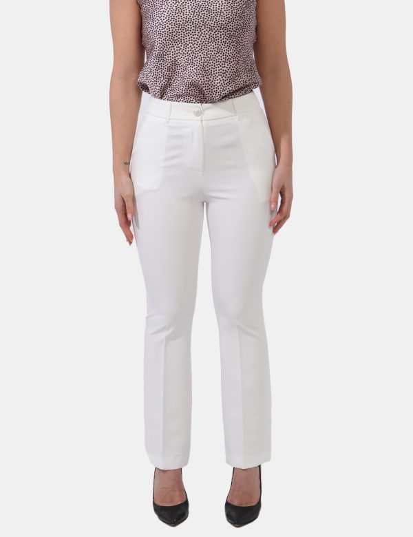 Pantaloni eleganti in total bianco. Presenti tasche a taglio trasversale sul fronte e fake tasche a taglio sul retro. La vestibilità è morbida e pratica grazie a bottone ad asola dorato con logo brand più zip. I pantaloni sono adatti per occasioni raffinate e facilmente combinabili. Dai un tocco di stile ai tuoi outfit.
