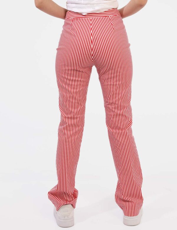Pantaloni stretti rigati bianco e rosso. La vestibilità è morbida e pratica grazie a bottone più zip. I pantaloni sono adatti per occasioni casual e facilmente combinabili. Aggiungili al tuo guardaroba e saprai sempre cosa mettere.