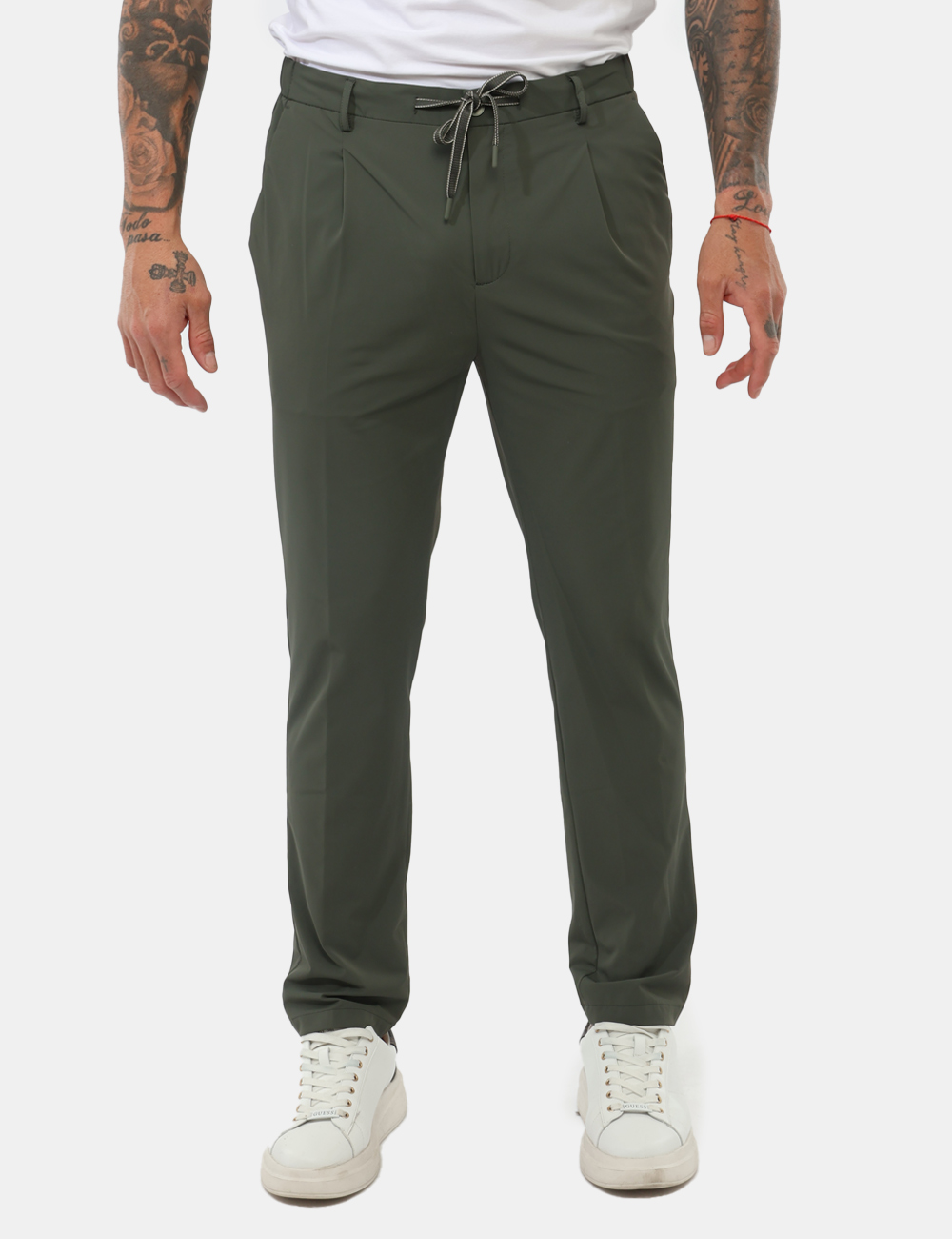 Puoi indossarli sia di giorno che di sera, creando outfit dinamici e sempre attuali. Abbinali a una giacca coordinata per un look più strutturato e contemporaneo, oppure scegli una t-shirt o una camicia per uno stile casual ma curato. Completa il tutto con sneakers o scarpe leggere per un risultato moderno e versatile. I pantaloni con chiusura con bottoni e laccetti, gamba stretta sono perfetti per chi cerca praticità senza rinunciare all’eleganza.