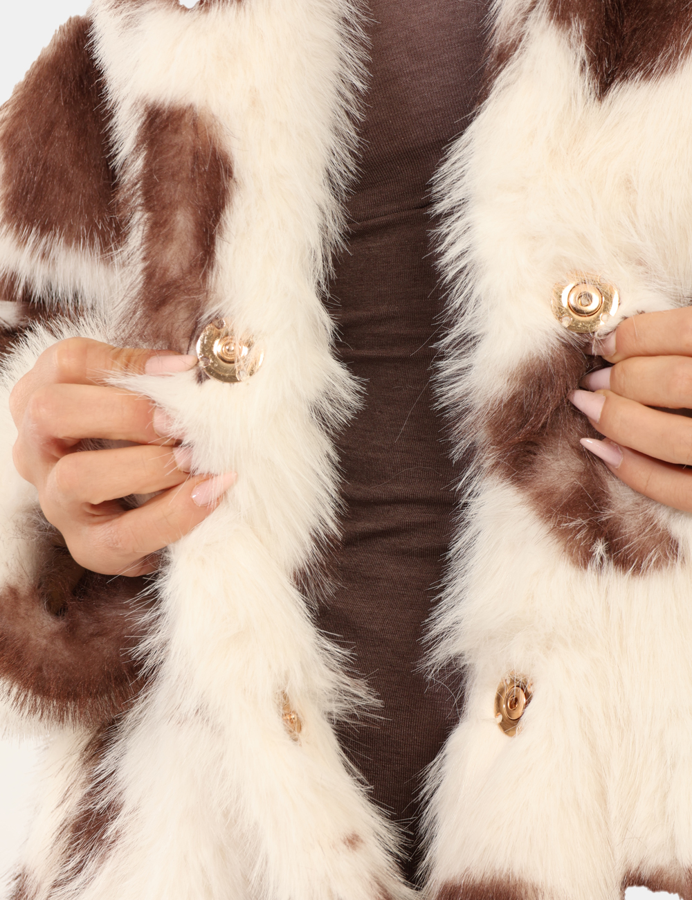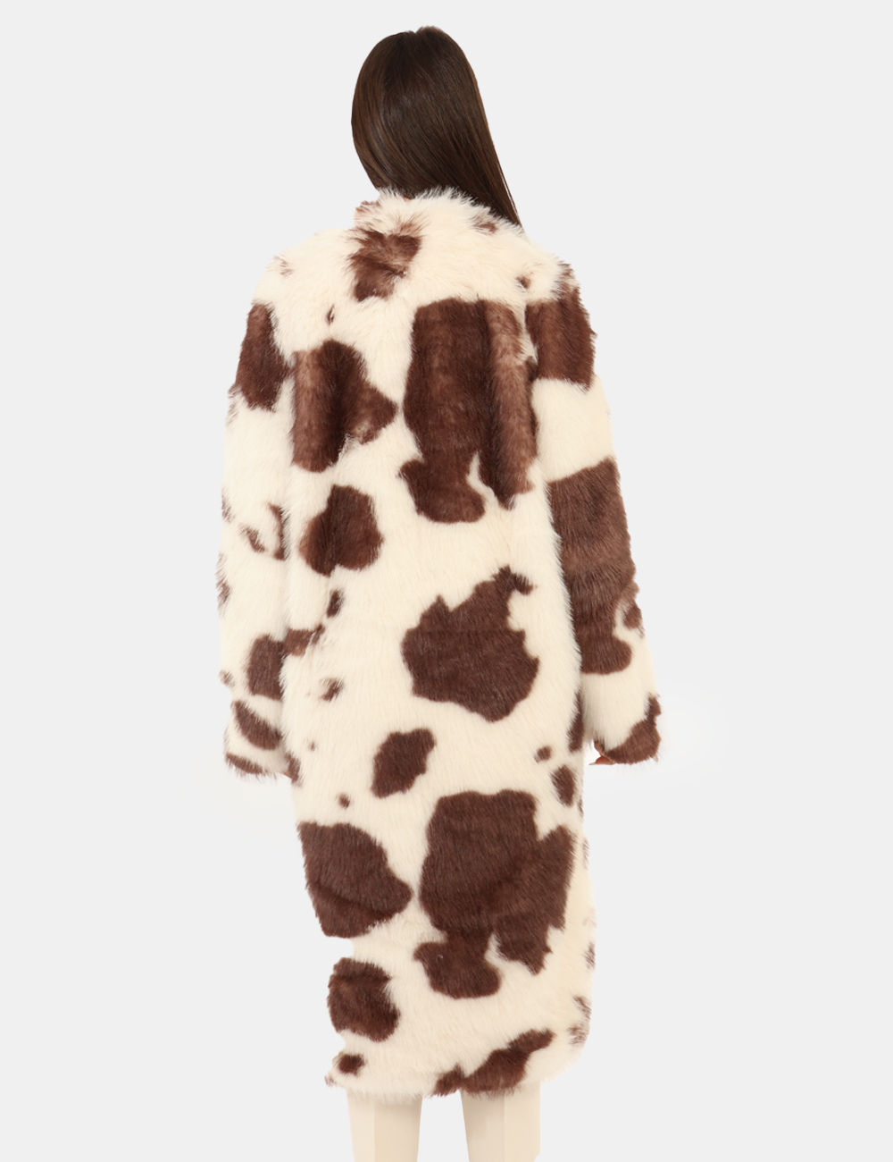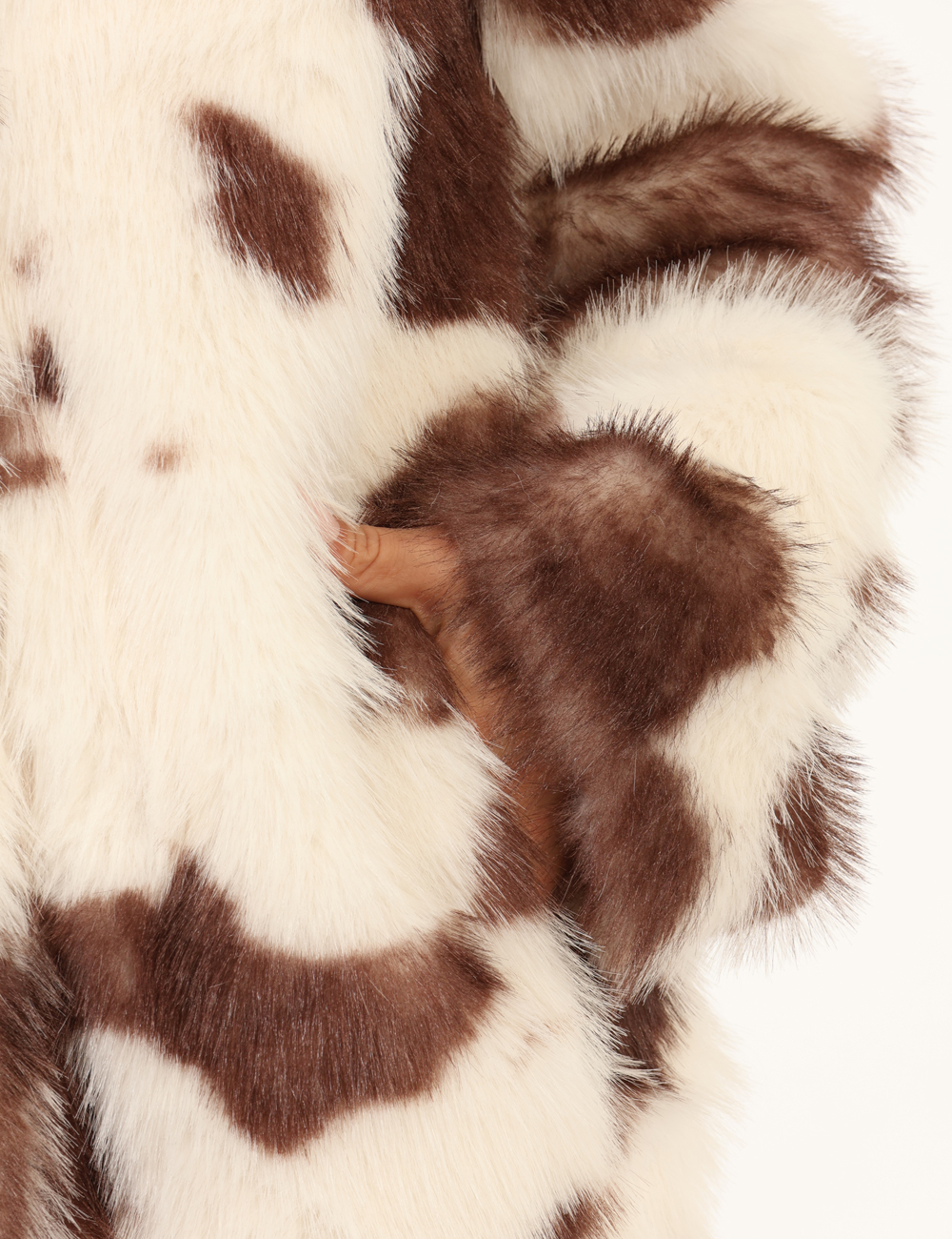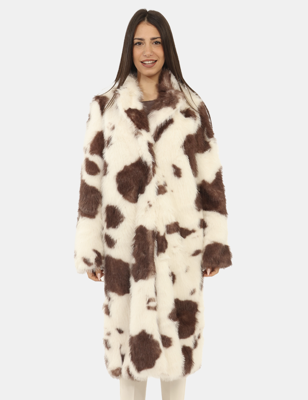 Pelliccia lunga in total bianco maculato marrone con girocollo alto. La vestibilità è morbida e pratica grazie a bottoni automatici in tinta. La pelliccia è adatta per occasioni raffinate. Dona un tocco di classe ai tuoi outfit.