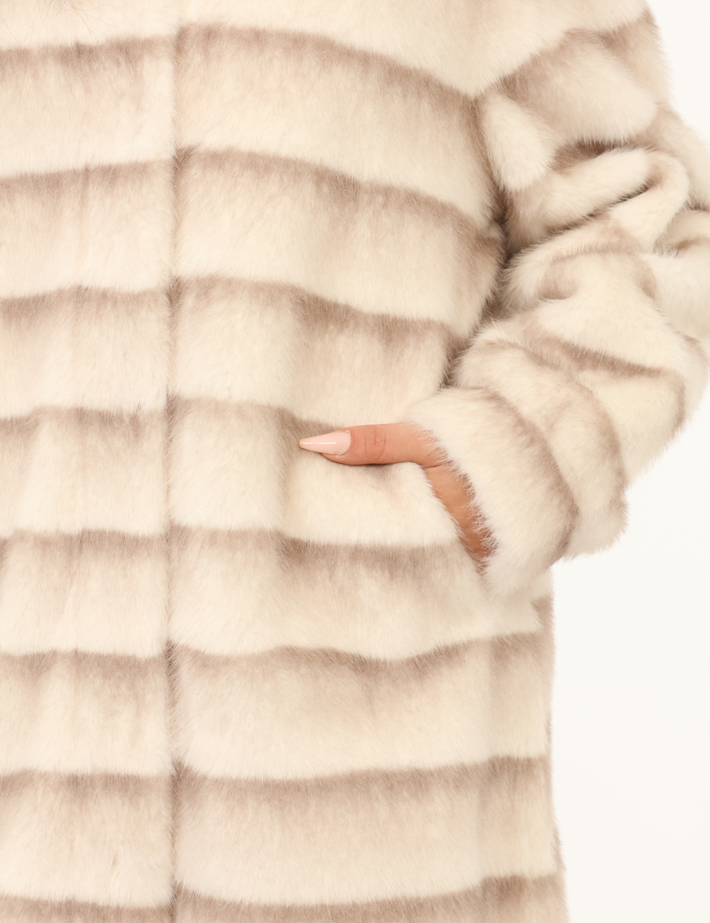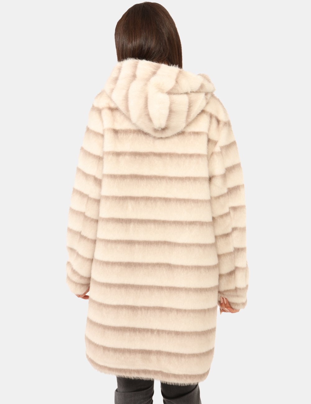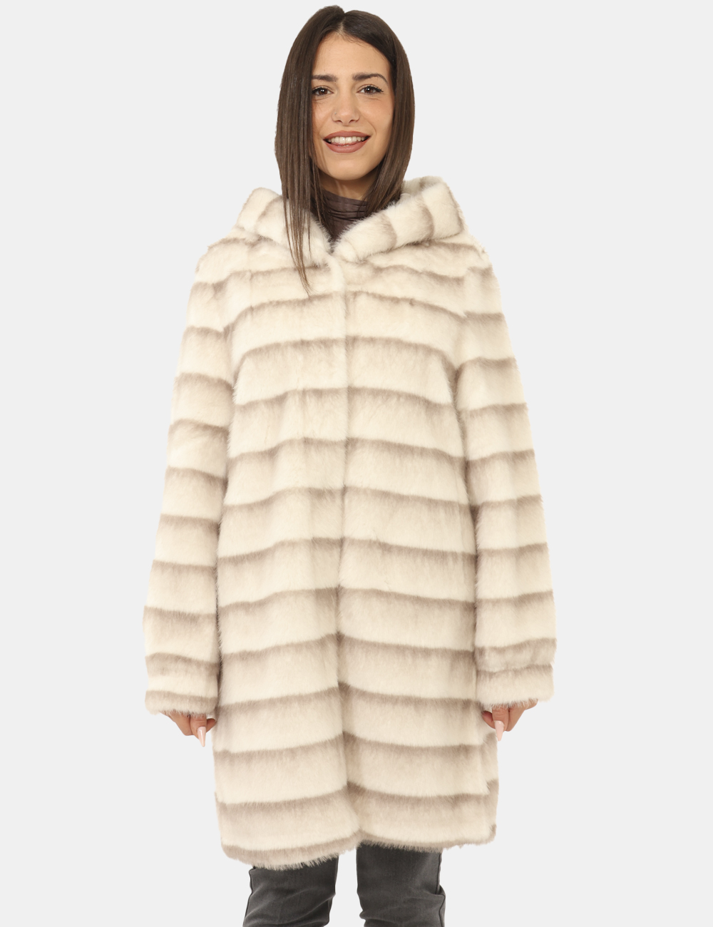 Pelliccia lunga con cappuccio, in total bianco panna su fantasia rigata. La vestibilità è morbida e pratica grazie a bottoni automatici, la pelliccia è adatta per occasioni raffinate. Dona un tocco di classe ai tuoi outfit.