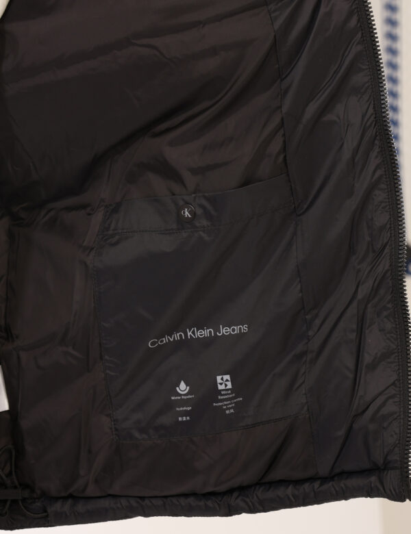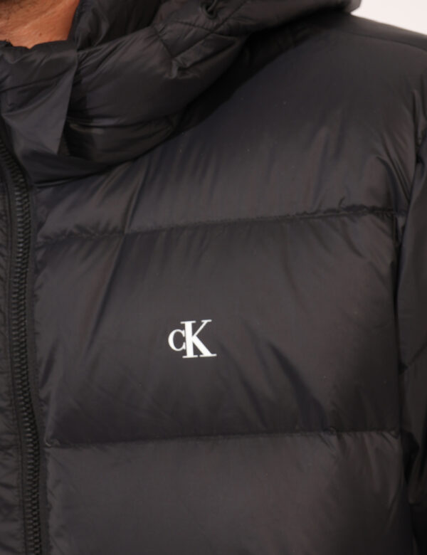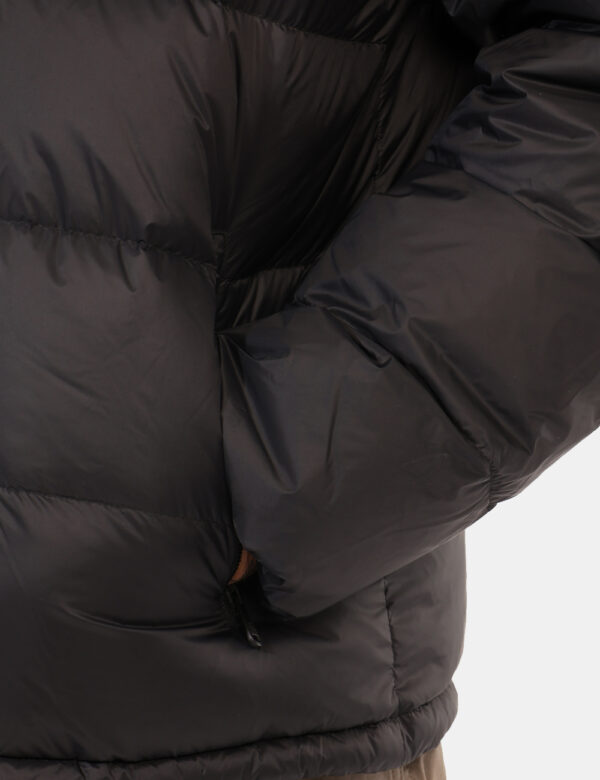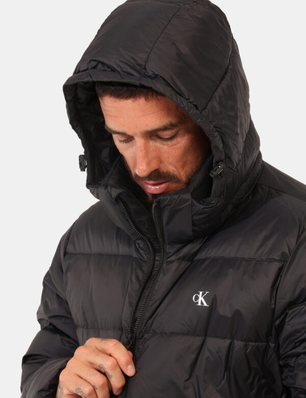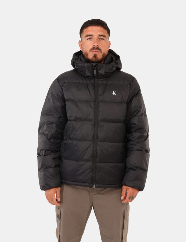 Piumin corto e con cappuccio, vestibilità morbida. Dettaglio logo brand stampato in bianco.