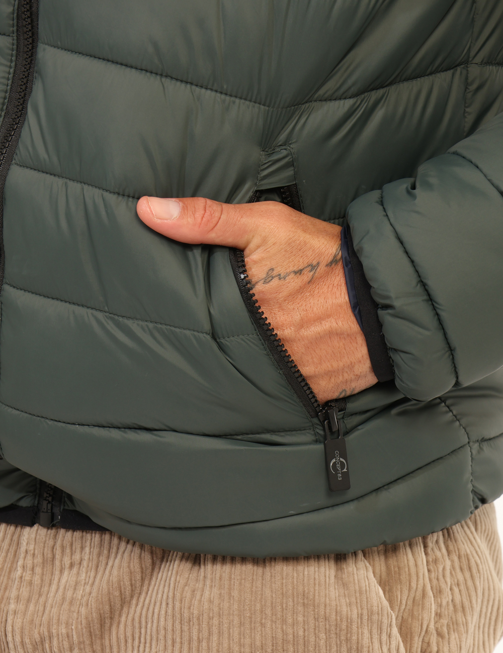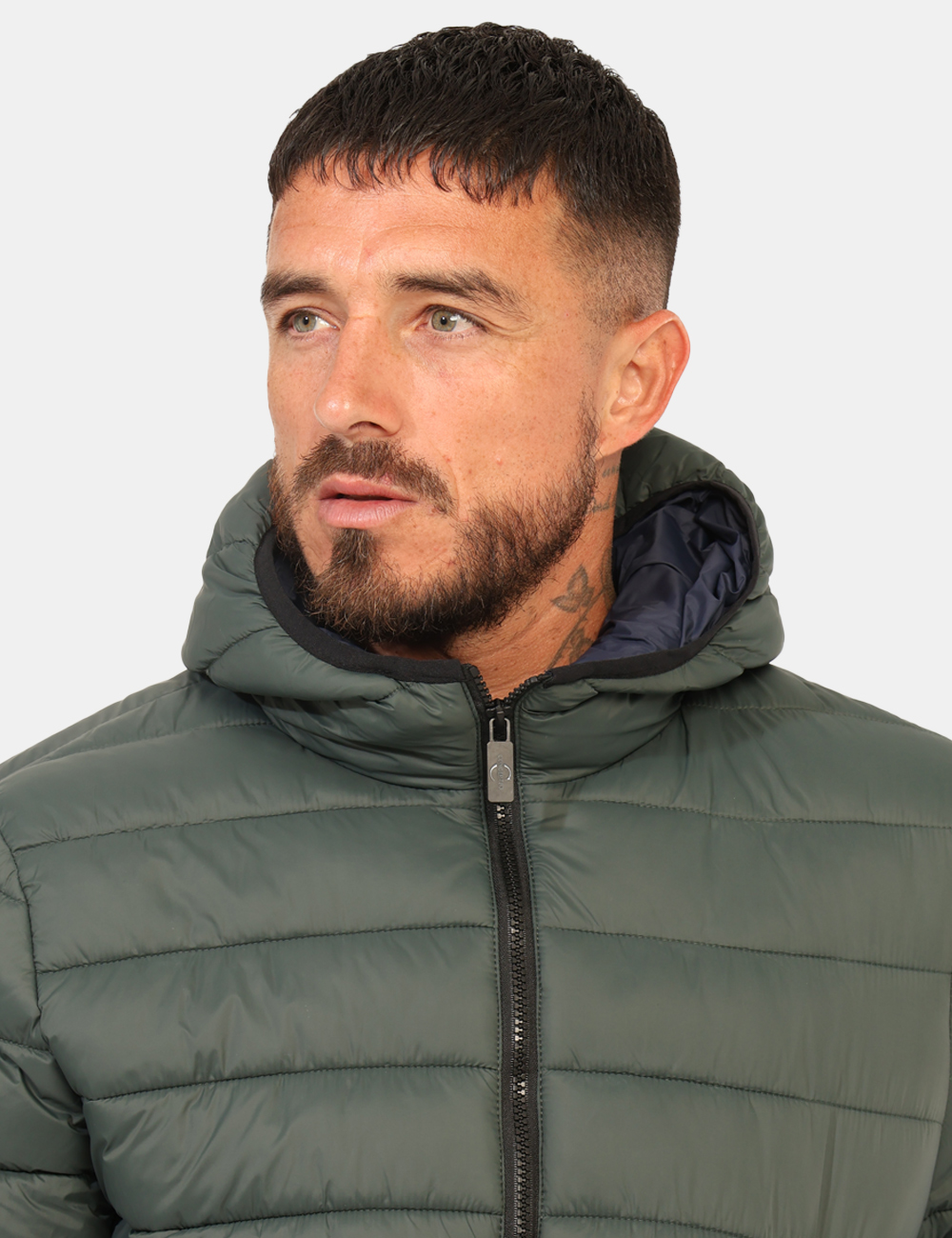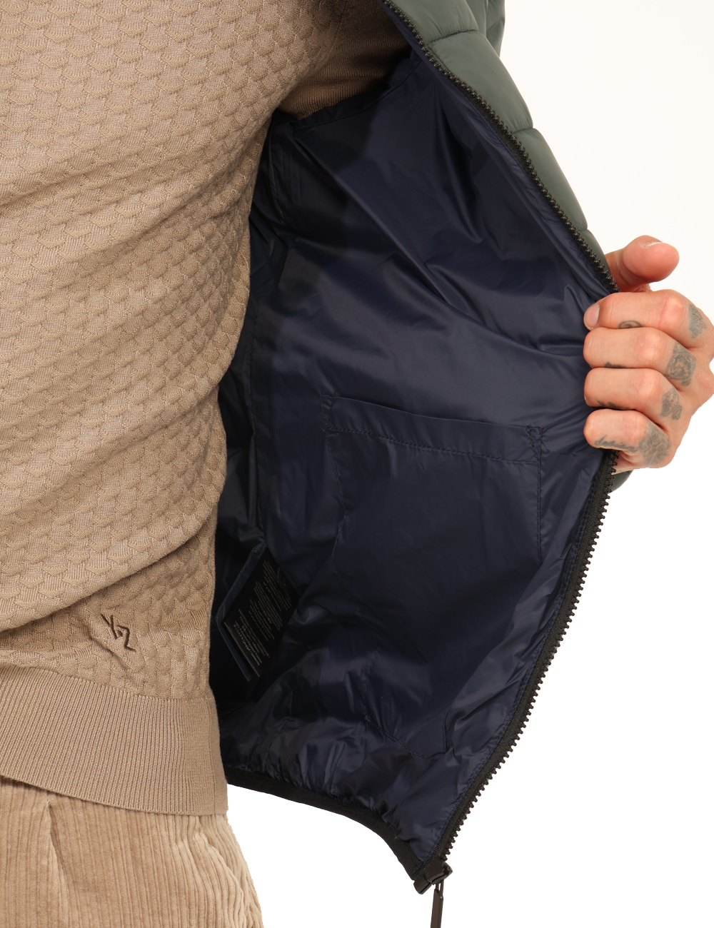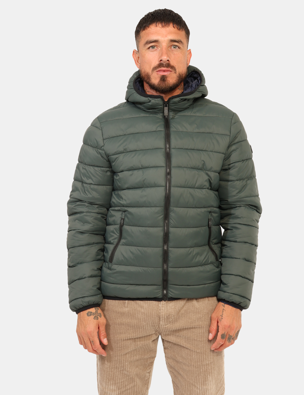 Piumino classico con cappuccio non removibile in total verde con dettagli neri. Presenti tasche a taglio trasversale. La vestibilità è morbida e pratica grazie a zip sul fronte. Il piumino è adatto per occasioni casual, ideale per l’inverno. Troppo comodo per poterne fare a meno.