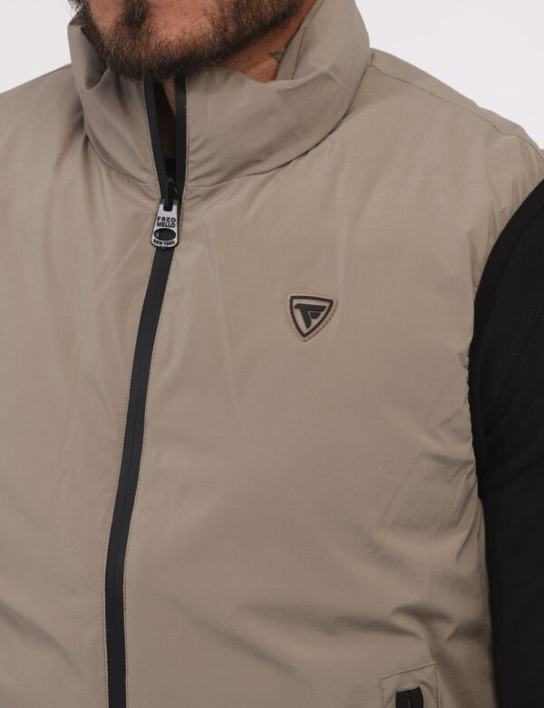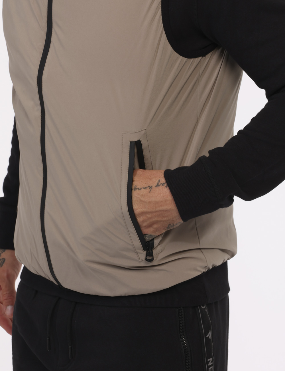 Piumino smanicato in total beige con bordini neri. Presenti tasche interne e tasche a taglio trasversale con chiusura a zip. La vestibilità è morbida e pratica grazie a zip sul fronte. Lo smanicato è adatto per occasioni casual e sportive. Praticità e stile in un solo capo.
