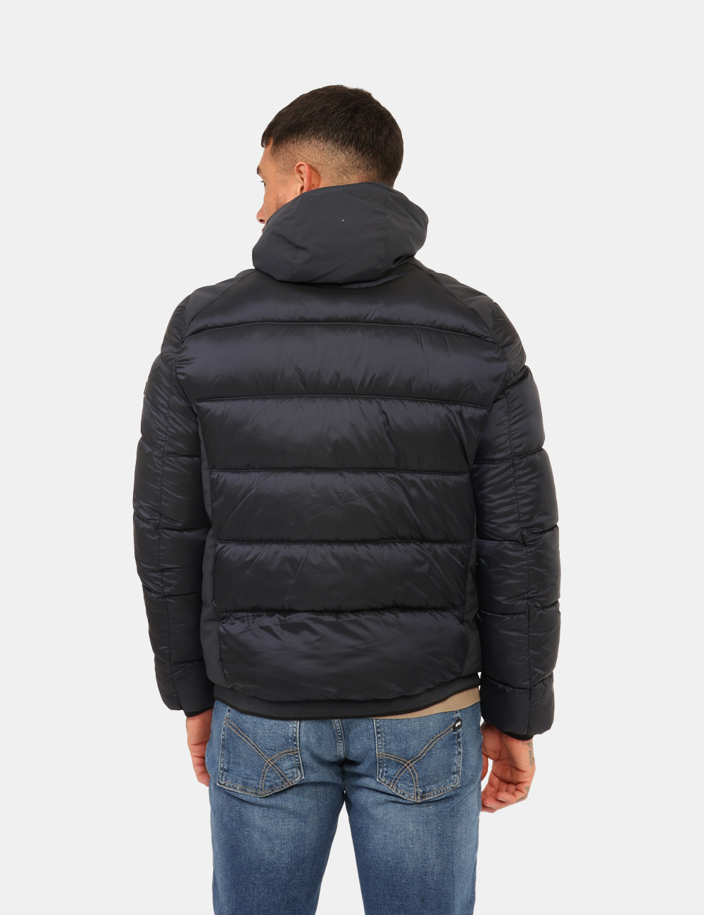 Piumino con cappuccio in total blu navy, con varie tasche. La vestibilità è morbida e pratica grazie a zip sul fronte. Il piumino è adatto per occasioni casual e facilmente combinabile. Praticità e stile in un solo capo.