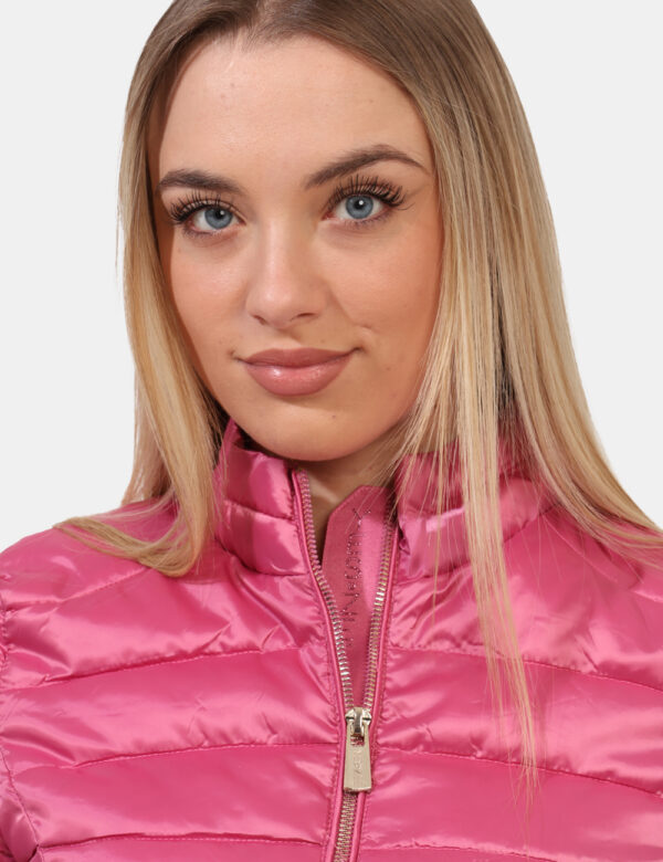 Piumino leggero in total fucsia con trama rigata. Presenti tasche a taglio trasversale con chiusura a zip più girocollo classico. La vestibilità è morbida e pratica grazie a zip sul fronte. Il piumino leggero è adatto per occasioni casual/raffinate. Praticità e stile in un solo capo.