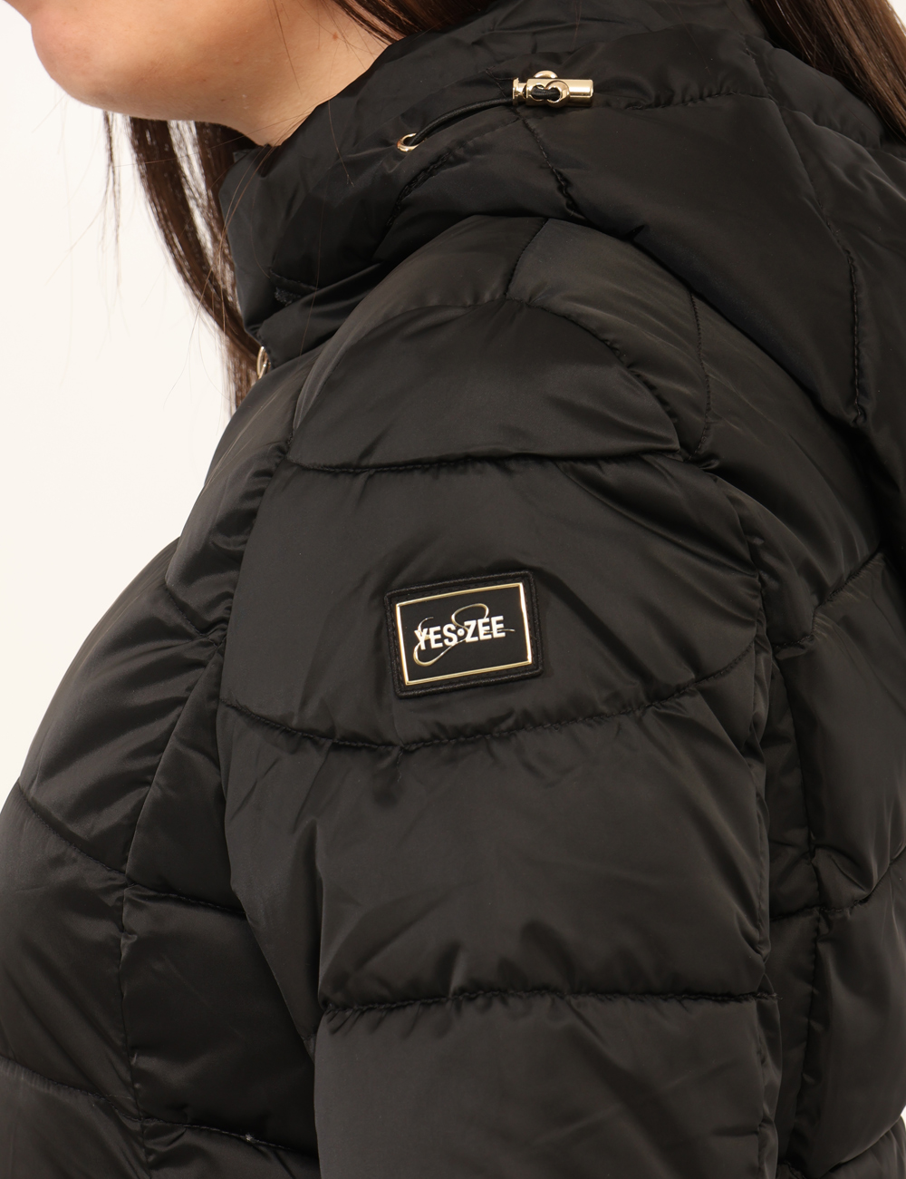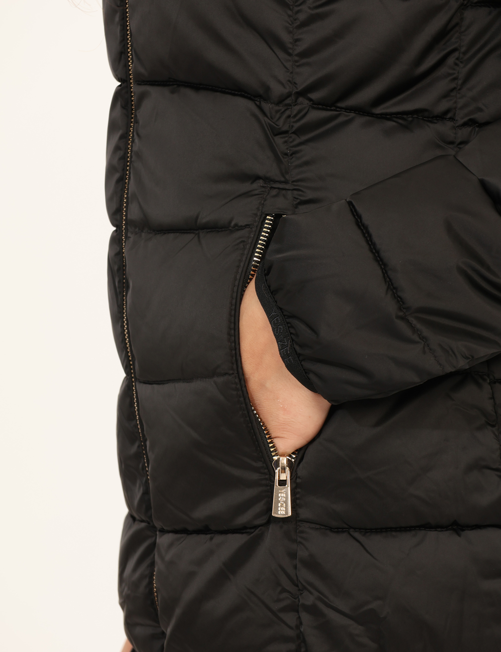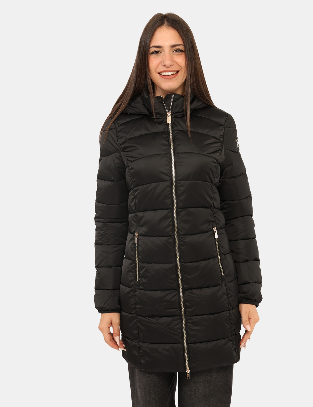 Piumino lungo, con cappuccio, in total nero e con dettagli dorati. Presenti tasche a taglio trasversale con cerniera lungo il fronte. Il piumino è adatto per occasioni casual e facilmente combinabile. Praticità e stile e in un solo capo.