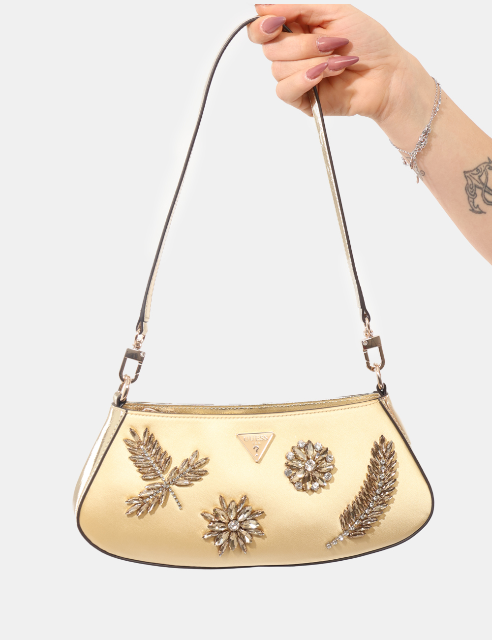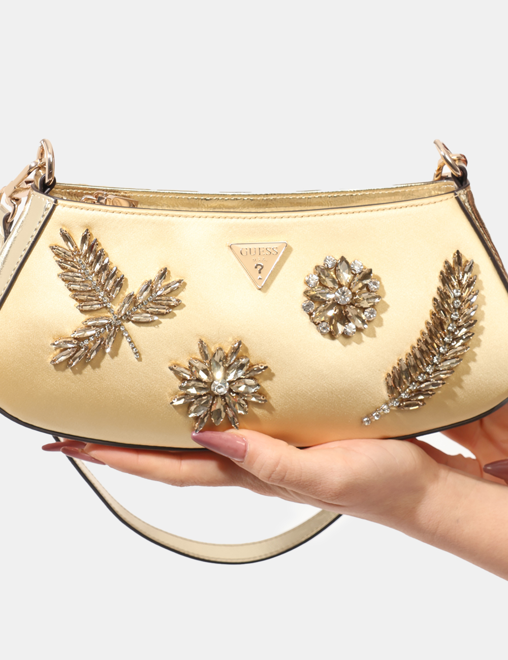 La Pochette GUESS Oro è l’accessorio perfetto per aggiungere un tocco prezioso e scenografico ai look femminili, in ogni periodo dell’anno. Pensata per la donna che ama distinguersi con eleganza, questa pochette colpisce per il suo design raffinato e luminoso, impreziosito da foglie e fiori in strass che catturano la luce e valorizzano l’outfit con un effetto gioiello. Il colore oro rende il modello sofisticato e senza tempo, ideale per completare look serali e occasioni speciali.