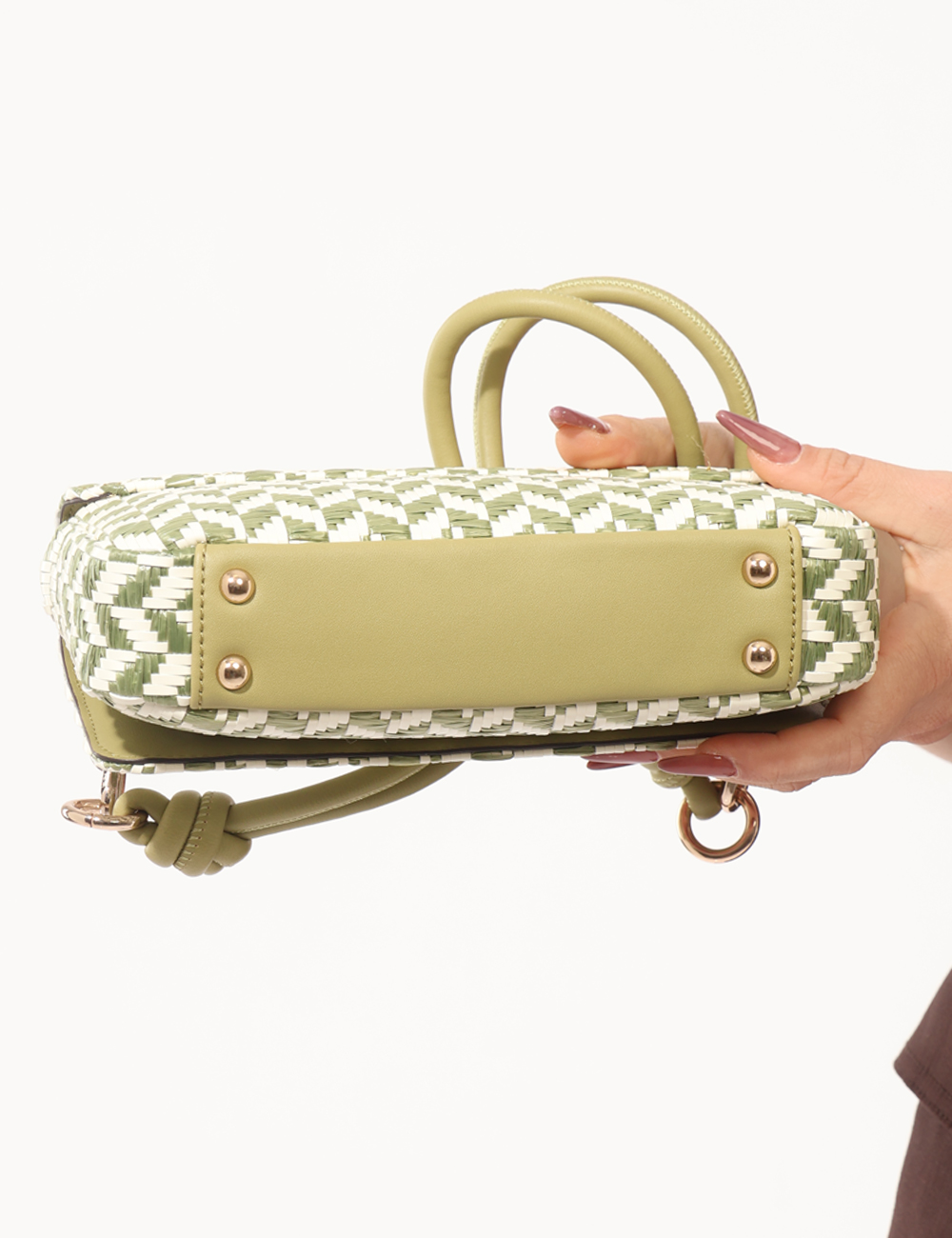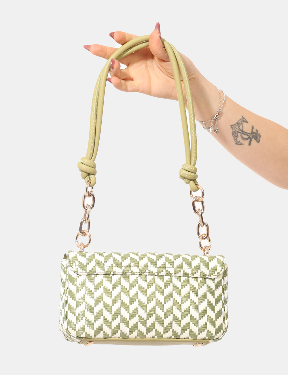 Realizzata in 100% poliuretano, questa pochette garantisce leggerezza, resistenza e facilità di utilizzo quotidiano. La pochette con tessuto simil raffia, manico singolo e catena dorata si abbina perfettamente a un look casual con jeans e t-shirt, ma completa con naturalezza anche abiti leggeri e outfit estivi dal gusto rilassato.