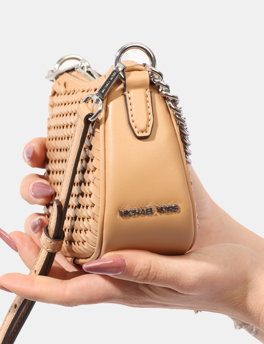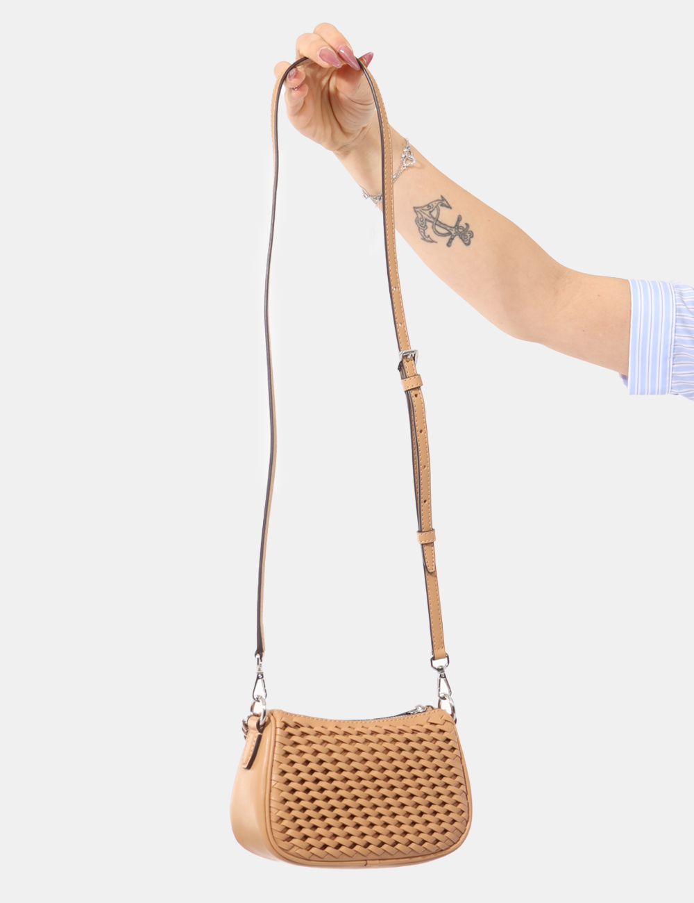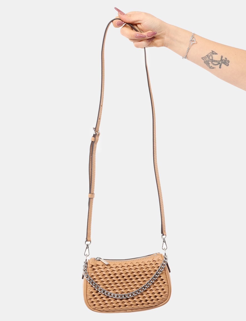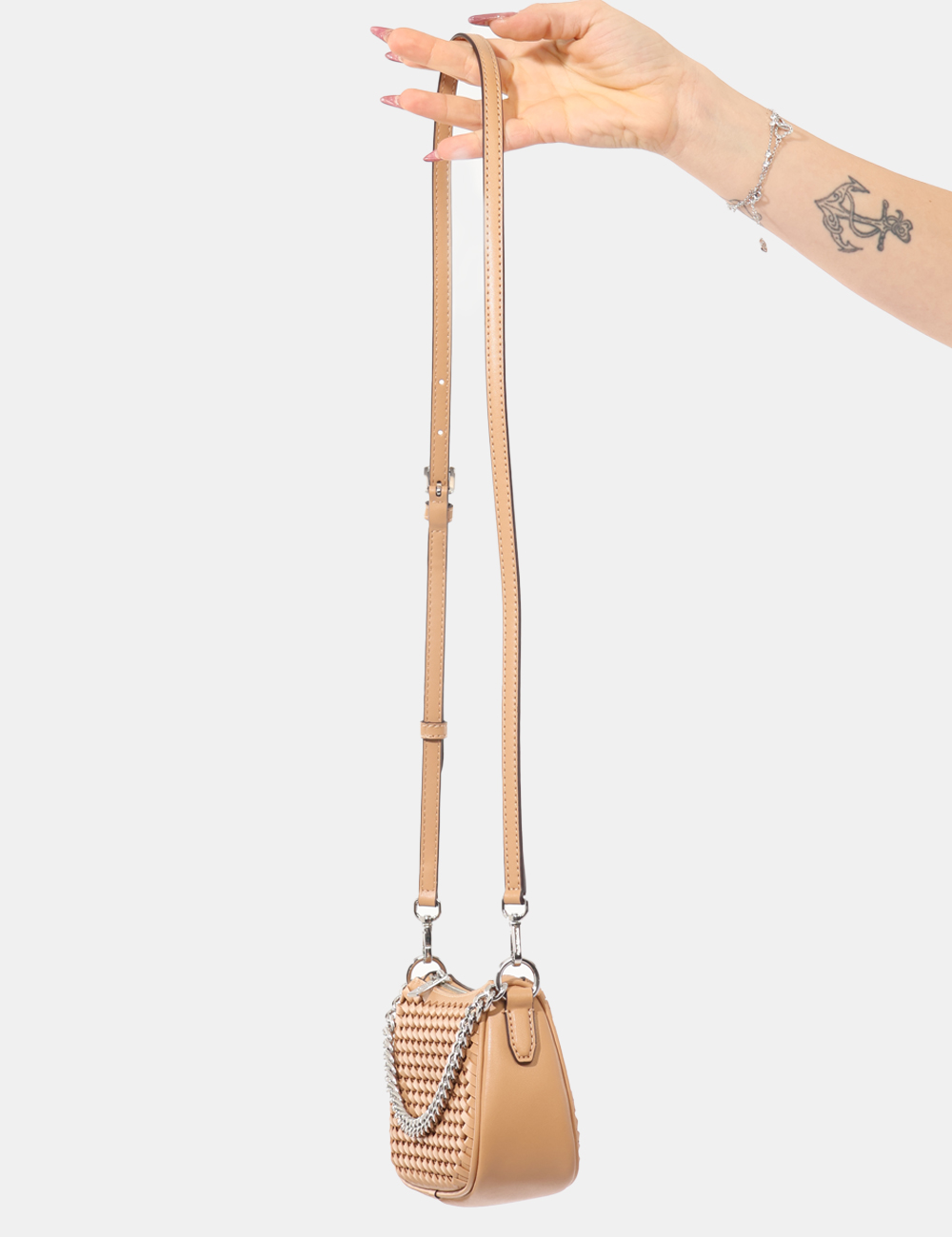 Il colore marrone, caldo e facilmente abbinabile, valorizza il tessuto traforato, dettaglio distintivo che dona leggerezza visiva e carattere al modello. La catenella argentata aggiunge una nota luminosa e permette di indossarla comodamente a spalla o a tracolla, lasciando le mani libere nei momenti più dinamici della giornata.