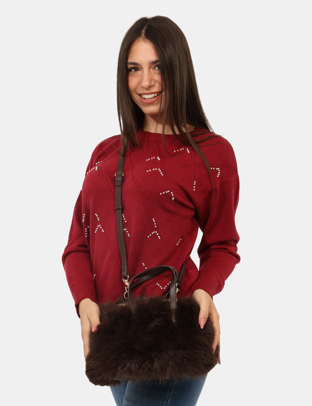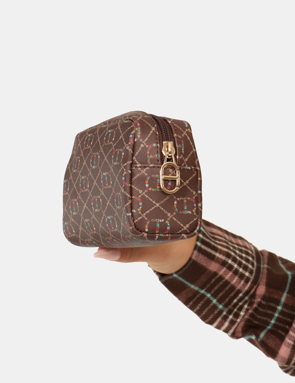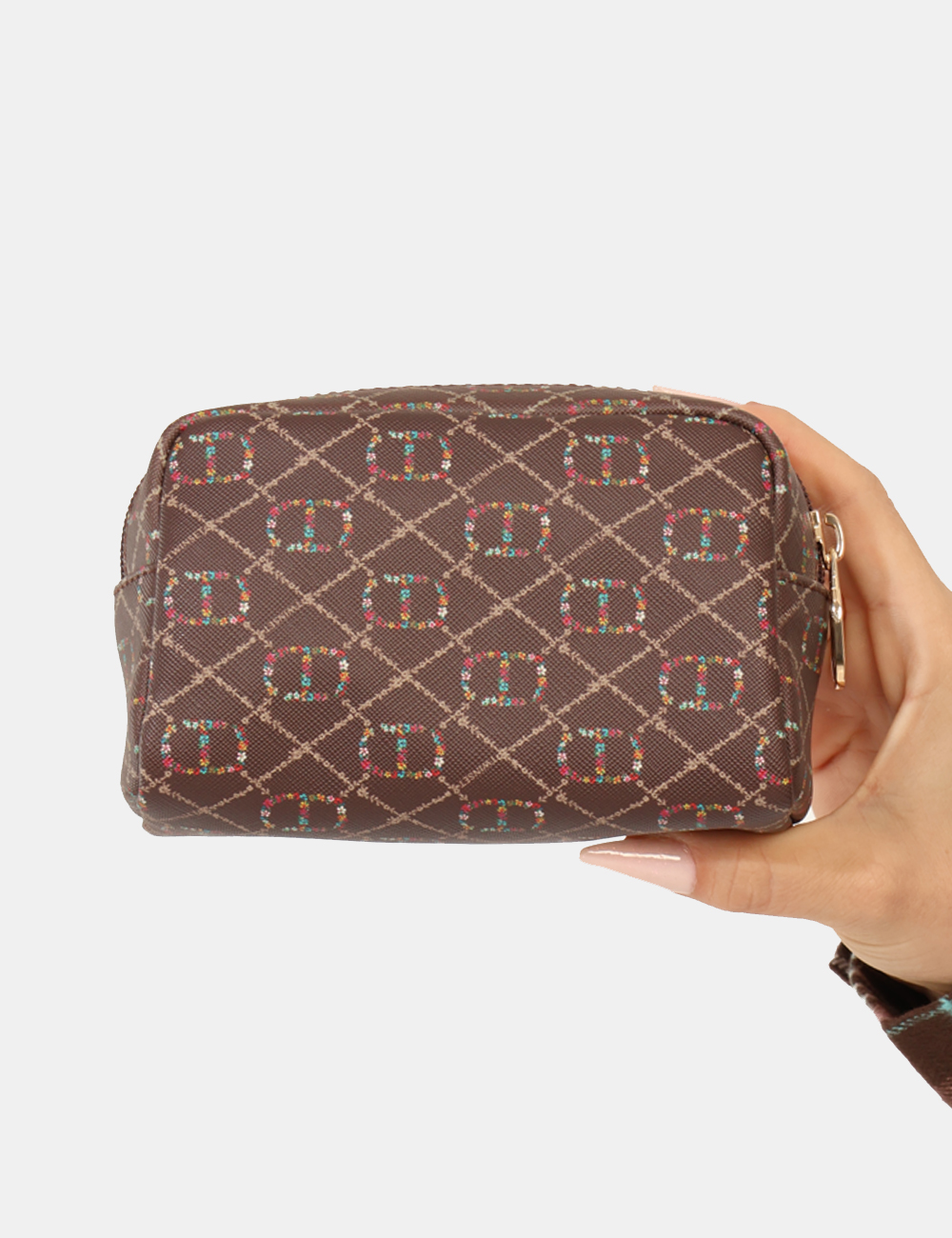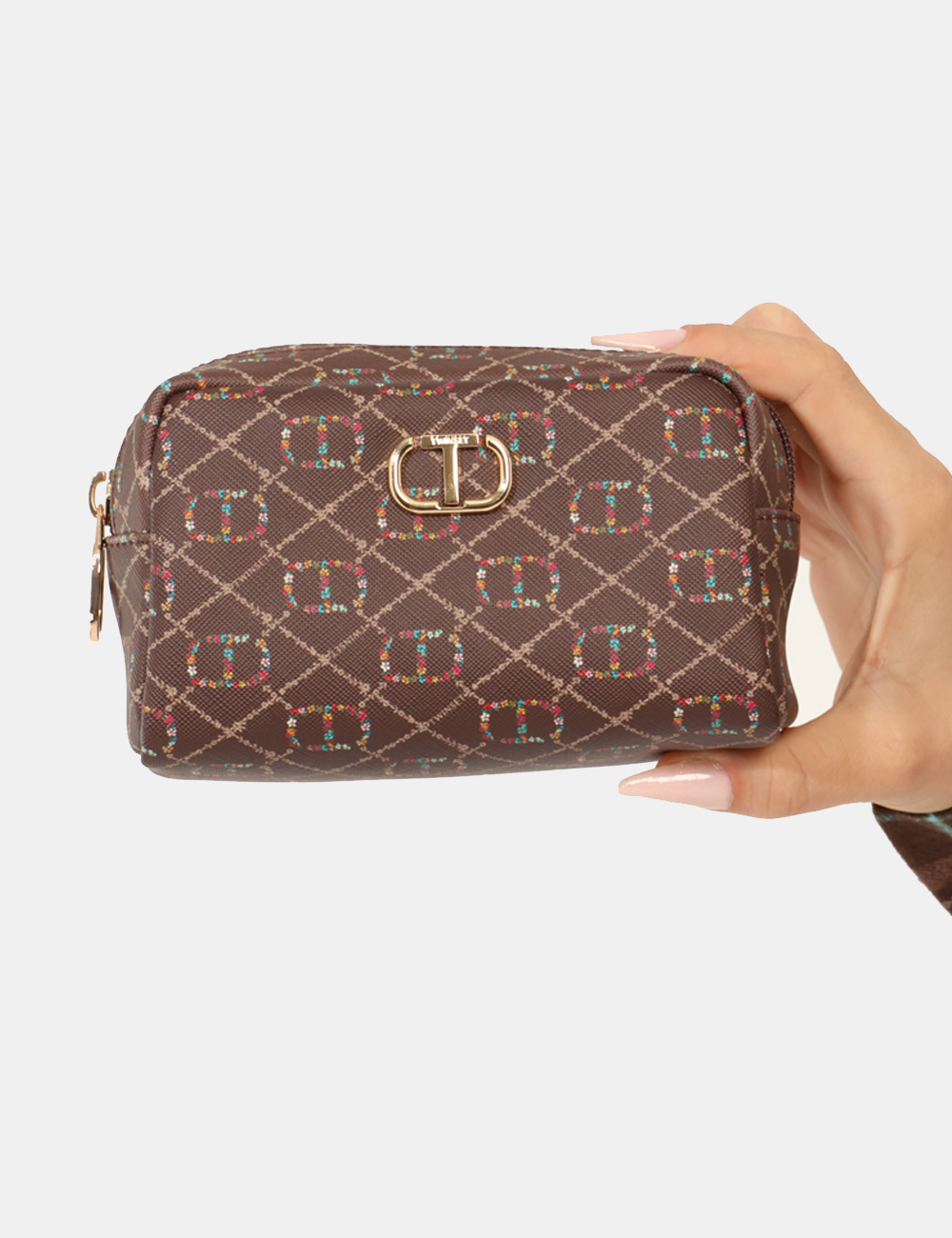Pochette marone con stampa in tinta più logo brand in metallo dorato, composta da unico scompartimento con chiusura a zip. Pratica e maneggevole, è adatta per occasioni casual, ideale anche come accessorio viaggio. Utilizzala una volta e scopri di non poterne più fare a meno.