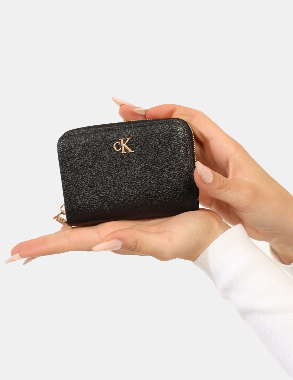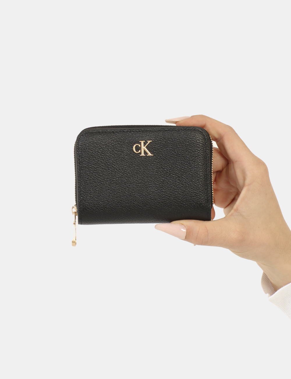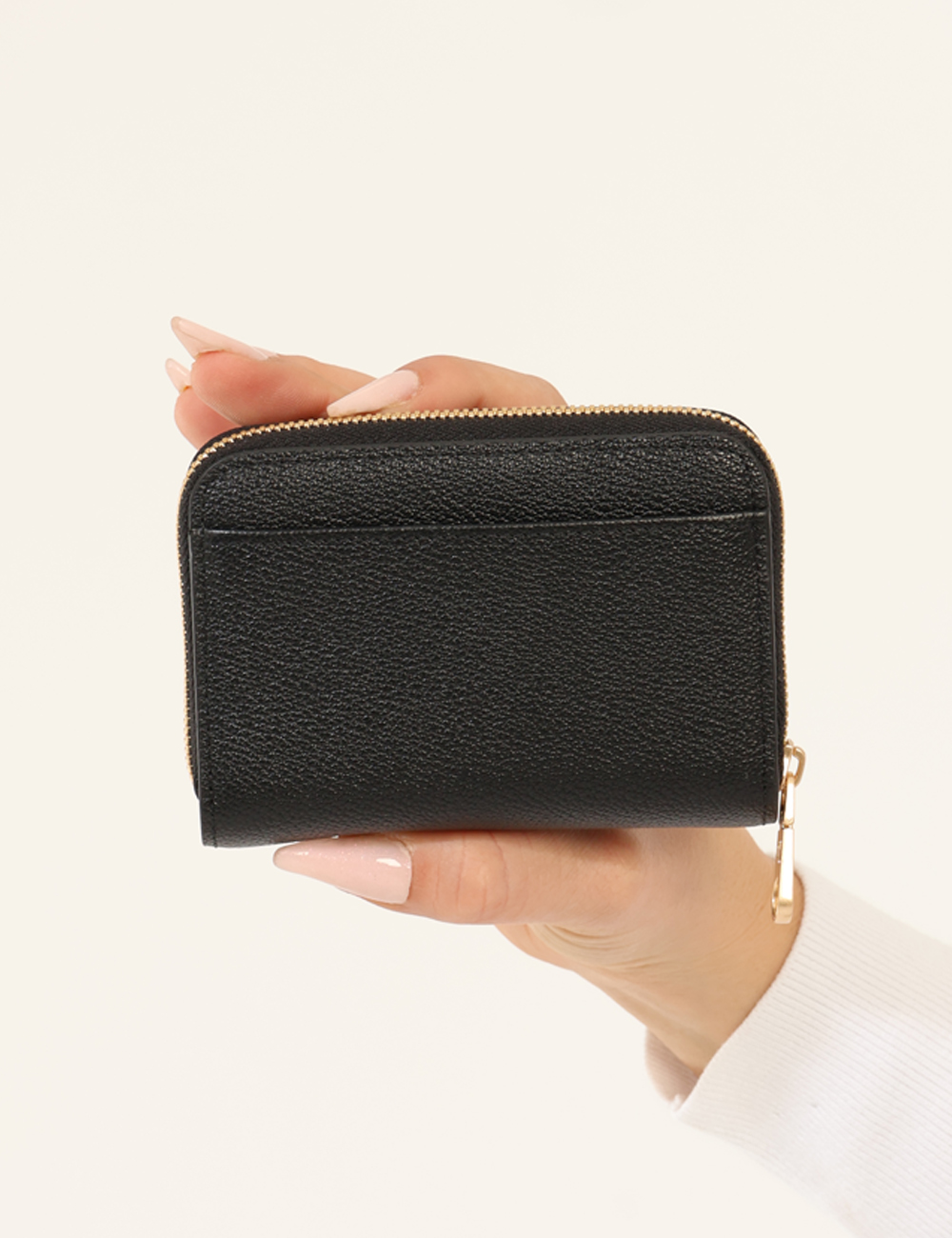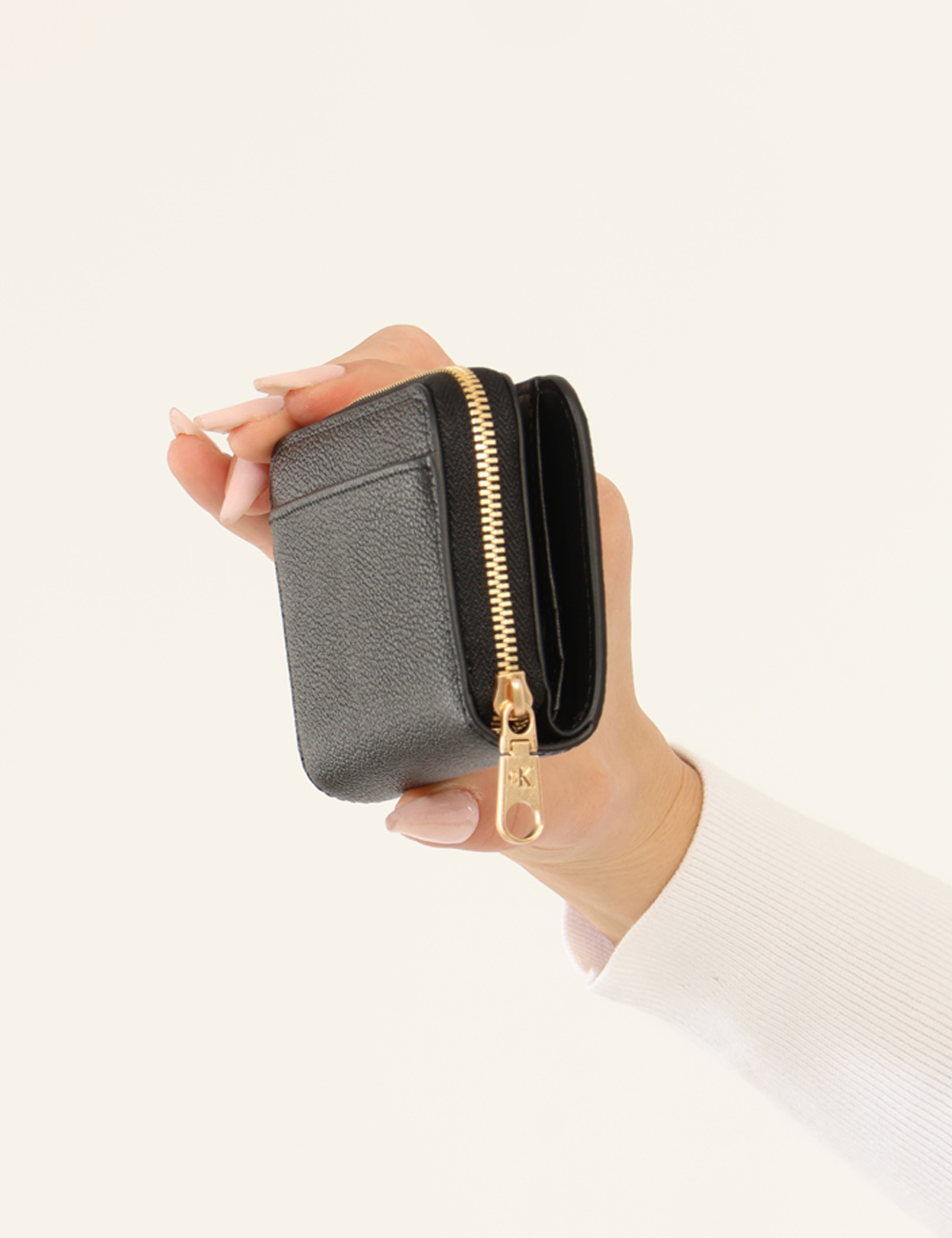 Portafogli di piccole dimensioni in total nero con logo brand in metallo dorato. Presente unico scompartimento con chiusura a bottone più varie taschine a fessura interne e portamonete con chiusura a zip. Il portafogli è adatto per occasioni casual e ideale con qualsiasi tipo di borsa. L’accessorio di cui non puoi fare a meno.