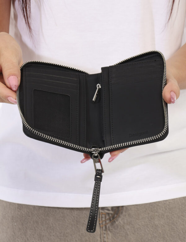 Portafoglio di medie dimensioni in total nero traforato con sfondo beige. Presente unico scompartimento con chiusura a zip più varie taschine interne e portamonete. Ideale per occasioni casual e facilmente combinabile con ogni tipo di borsa. Troppo comodo per poterne fare a meno.