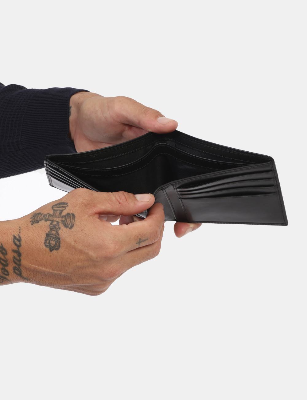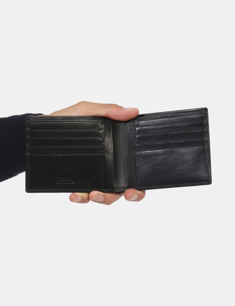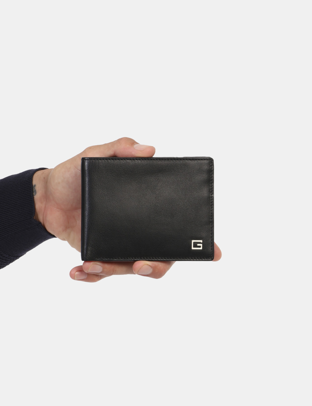 Portafoglio piatto di piccole dimensioni in cuoio e total nero. Presente unico scompartimento con varie taschine portatessere. Troppo comodo per poterne fare a meno.