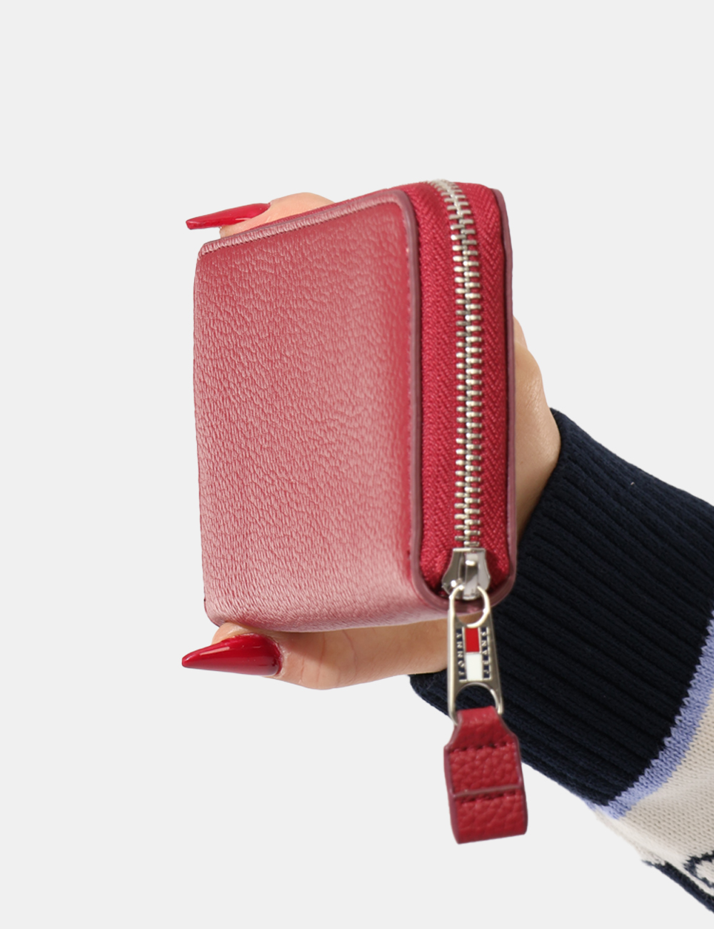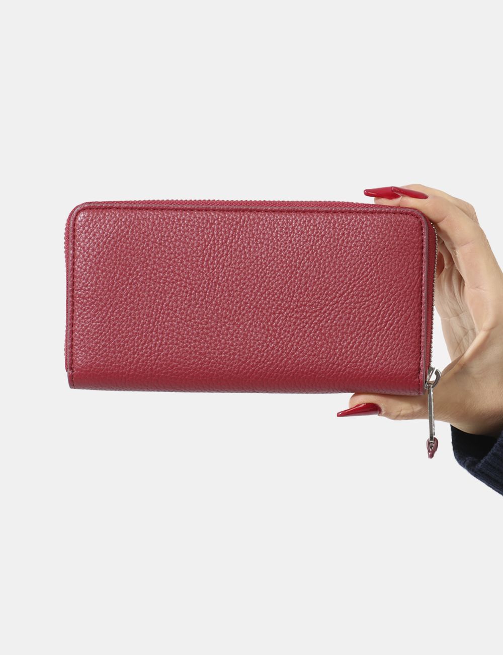 Portafogli total rosso ciliegia con unico scompartimento, chiusura a zip e taschine interne a fessura. Pratico e maneggevole è ideale con ogni tipo di borsa. L’accessorio di cui non puoi fare a meno.