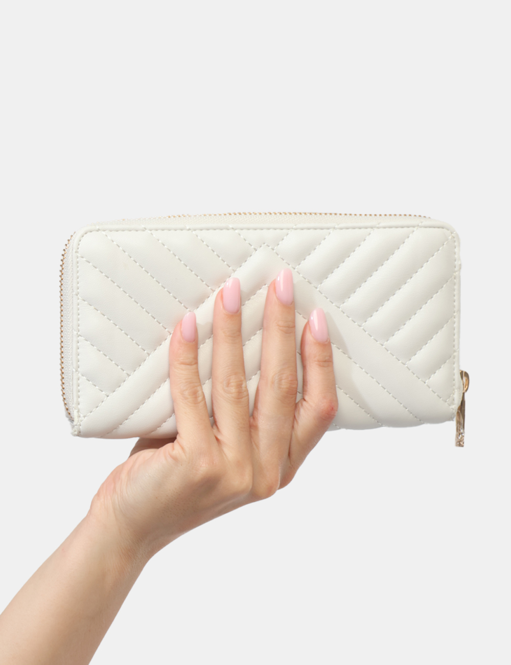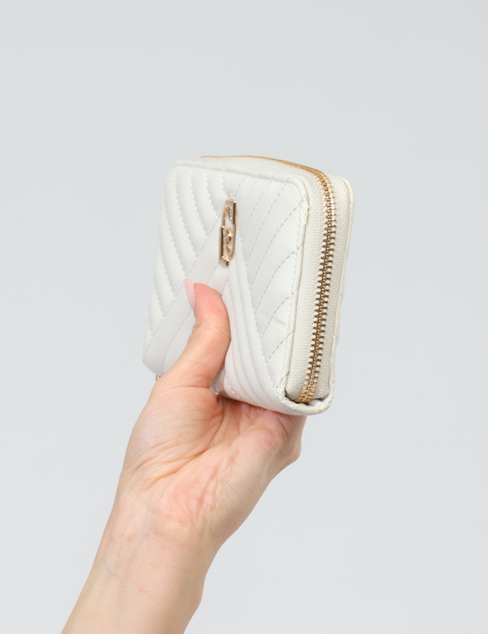 Perfetto da utilizzare ogni giorno, sia nel tempo libero che in ufficio, questo portafoglio con tessuto trapuntato, zip dorata si abbina facilmente a una borsa coordinata o a un look casual chic, completando il tuo stile con discrezione ed eleganza.