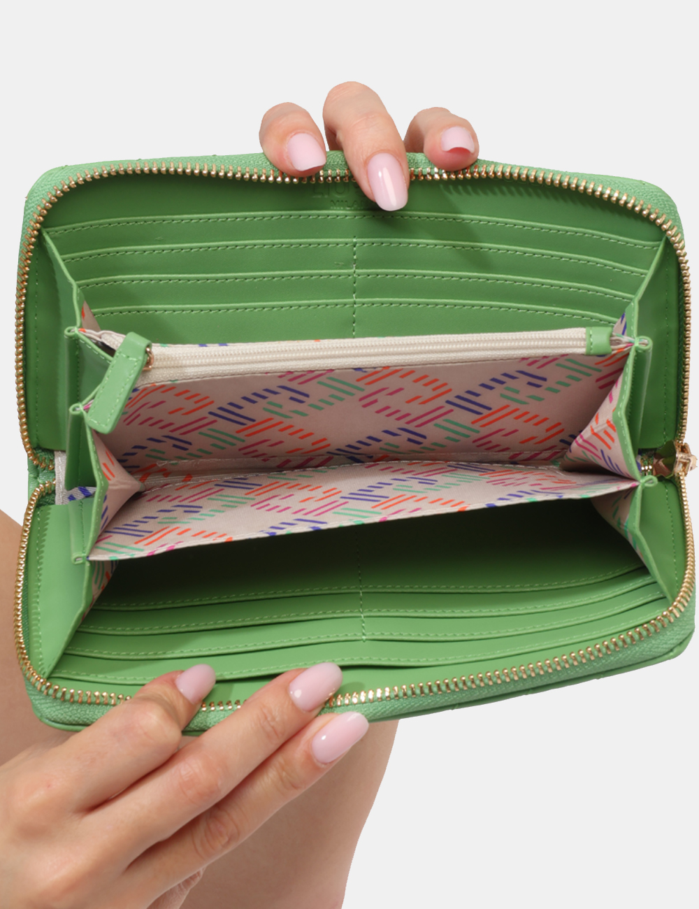 La zip dorata dona luminosità e un tocco sofisticato, valorizzando la tonalità verde e rendendo questo accessorio unico e facilmente riconoscibile. Le dimensioni compatte (base 20 cm, altezza 10 cm, profondità 2 cm) permettono di organizzare con ordine carte, contanti e piccoli oggetti essenziali. L’articolo può presentare piccoli difetti nella confezione o nel tessuto, senza comprometterne l’utilizzo quotidiano.