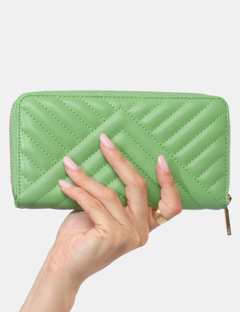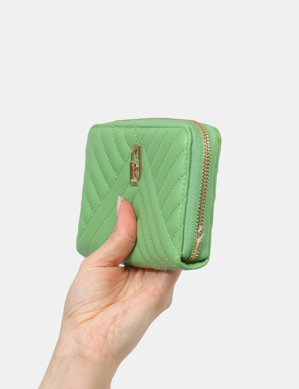 Perfetto da utilizzare nel tempo libero o anche in ufficio, questo portafoglio con tessuto trapuntato, zip dorata si abbina facilmente a una borsa coordinata o a un look casual, aggiungendo un tocco curato e contemporaneo al tuo stile.