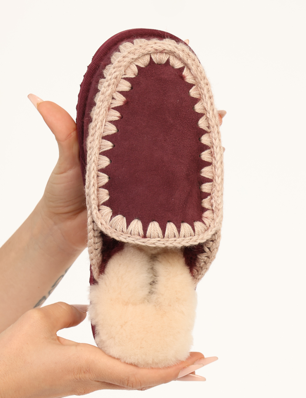 Sabot in misto lana, tessuto scamosciato bordeaux con dettagli in corda ed interno caldo in fake fur abbinato. L’indossatura è morbida e avvolgente, super comoda anche grazie alla suola rialzata. Le sabot sono adatte per occasioni casual, ideali per l’inverno. Affronta la stagione più fredda con stile e morbidezza.
