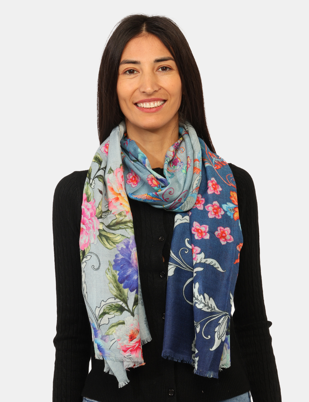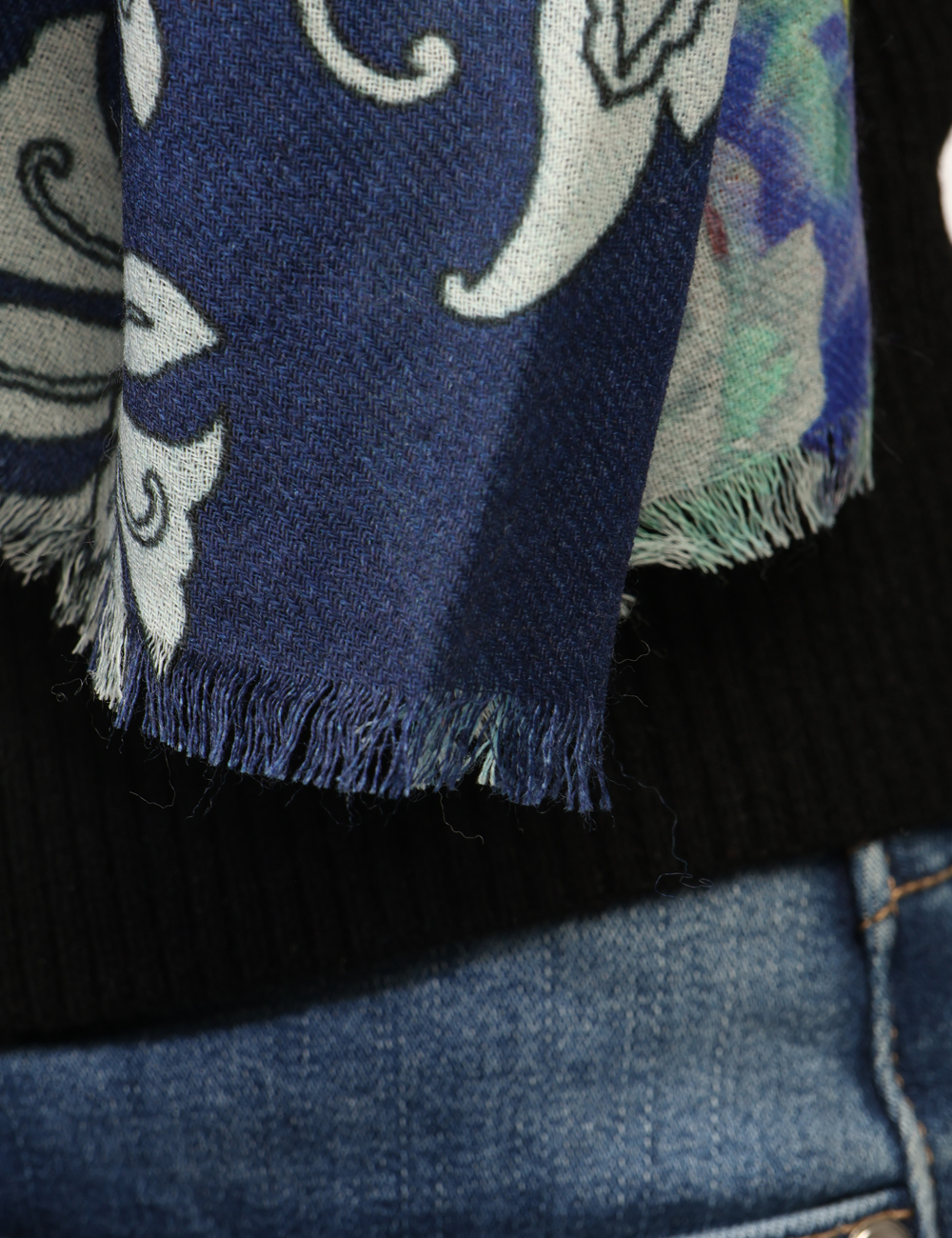 Sciarpa in lana e seta, su fantasia floreale tendente al blu. Indossatura pratica e maneggevole. La sciarpa è adatto per occasioni casual. Dona un tocco di freschezza e colore ai tuoi outfit.