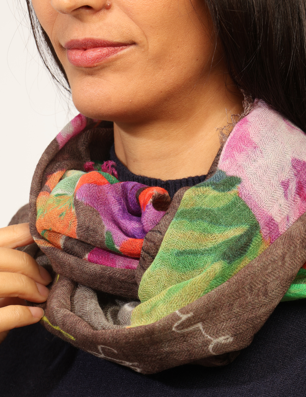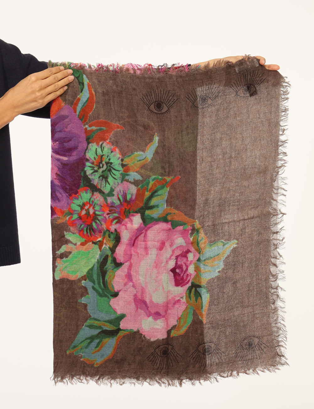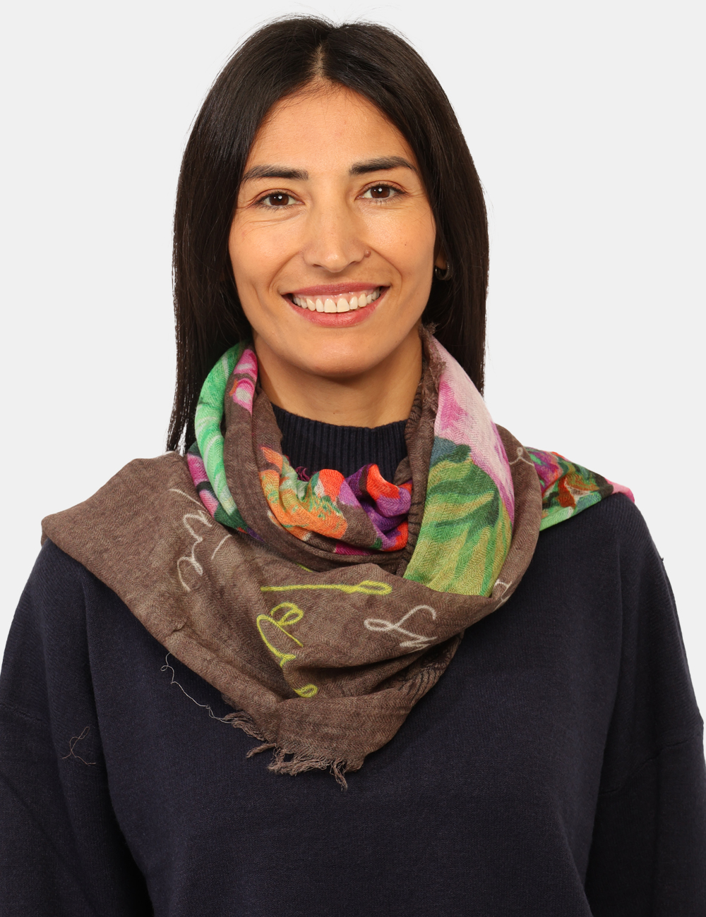 Sciarpa in misto lana, su fantasia floreale tendente al grigio. Indossatura pratica e maneggevole. La sciarpa è adatta per occasioni casual. Dona un tocco di freschezza e colore ai tuoi outfit.