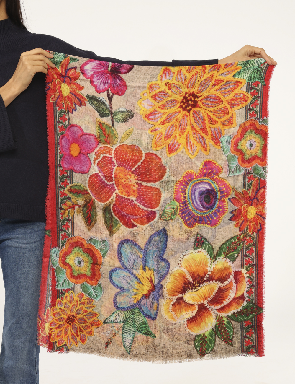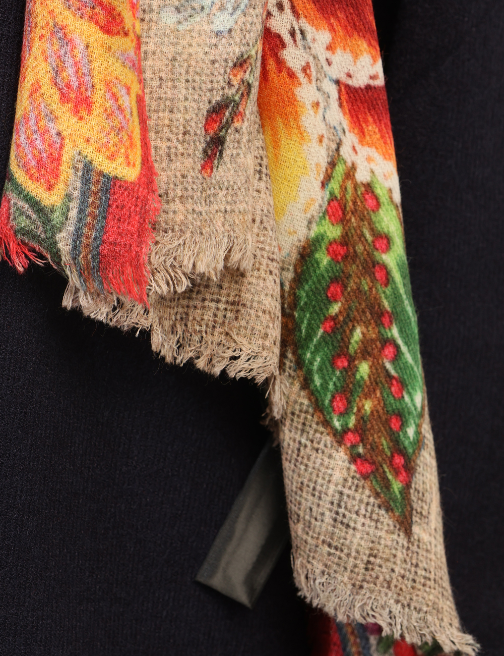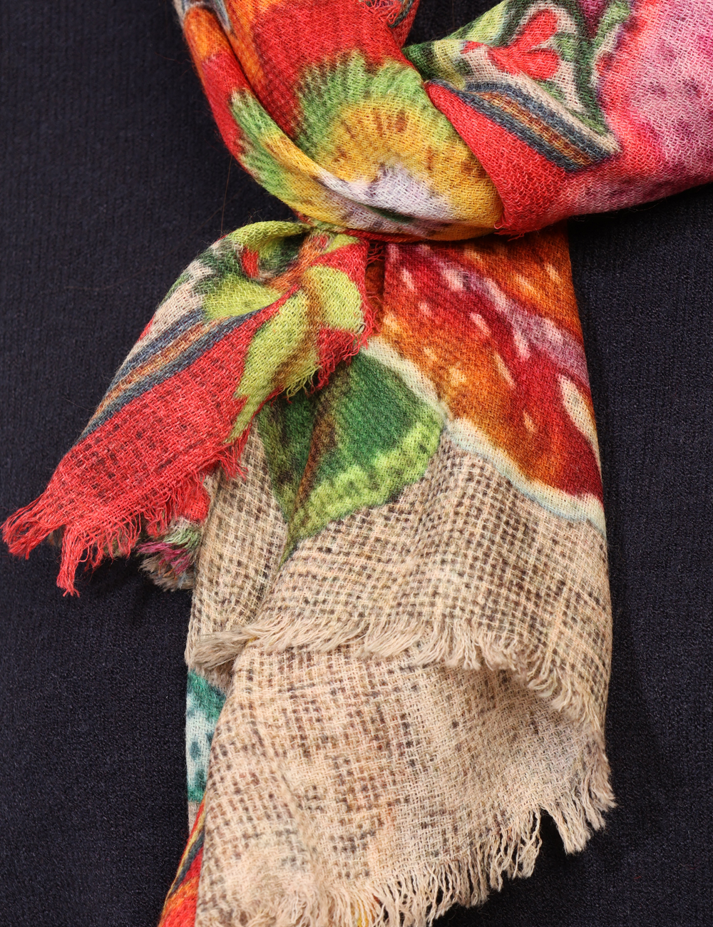 Sciarpa in misto lana, su fantasia floreale tendente al giallo e rosso. Indossatura pratica e maneggevole. La sciarpa è adatta per occasioni casual. Dona un tocco di freschezza e colore ai tuoi outfit.