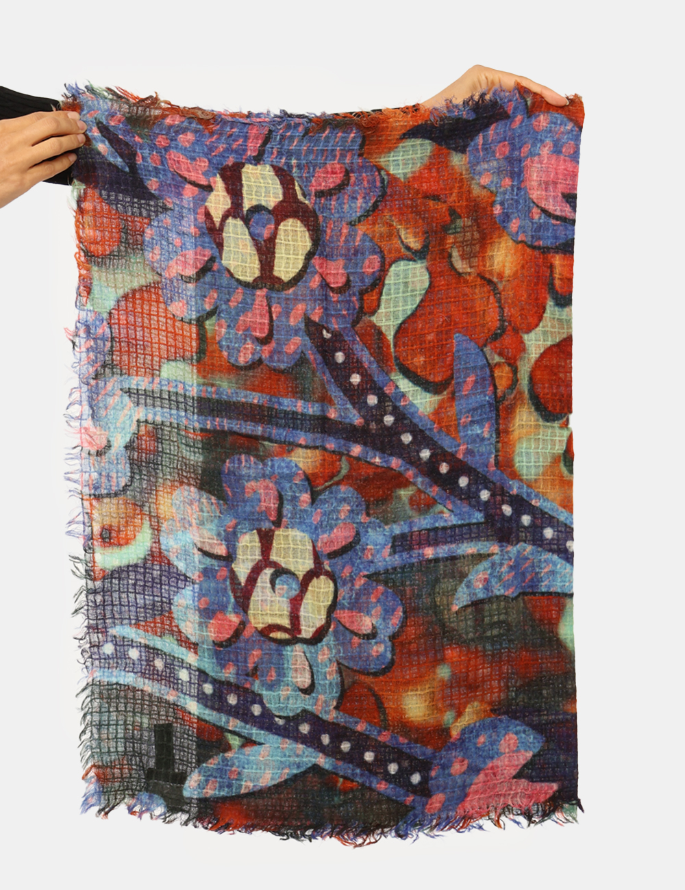 Sciarpa in total lana, su fantasia floreale tendente al blu e arancione. Indossatura pratica e maneggevole. La sciarpa è adatta per occasioni casual. Dona un tocco di freschezza e colore ai tuoi outfit.