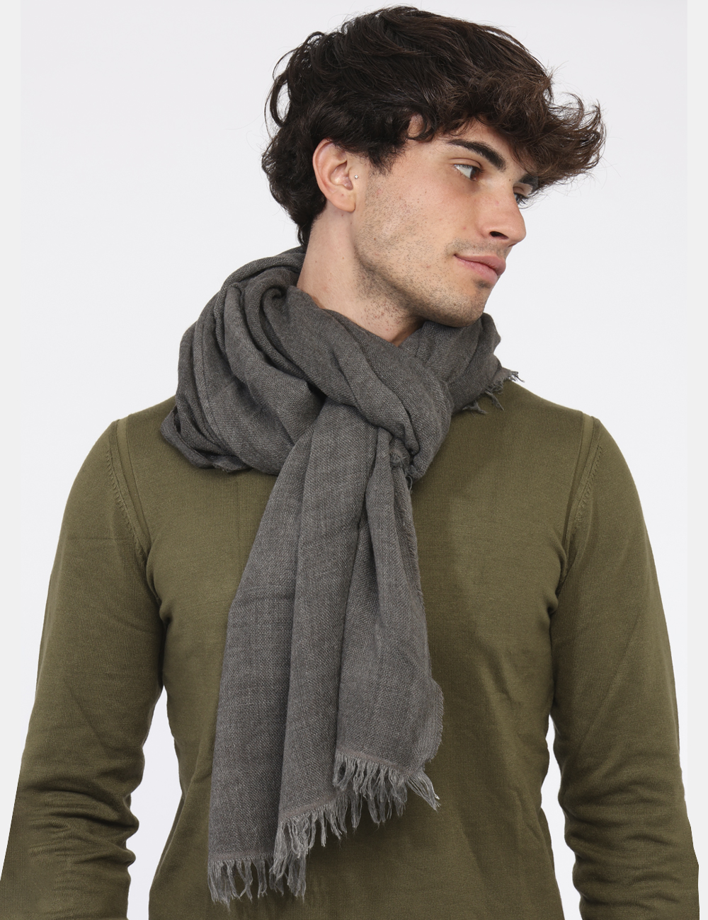 Sciarpa in misto lana ed in total grigio. L’indossatura è pratica e morbida. La sciarpa è ideale per occasioni casual e facilmente combinabile. Un accessorio semplice ma ricco di stile per il tuo inverno.
