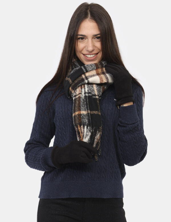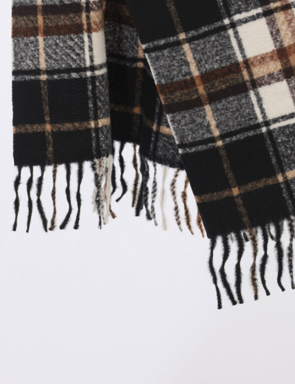 Sciarpone con frange in fantasia quadrettata su base marrone e nera. L’accessorio è molto caldo e avvolgente. Indossalo per affrontare l’inverno con stile ed un tocco di colore.